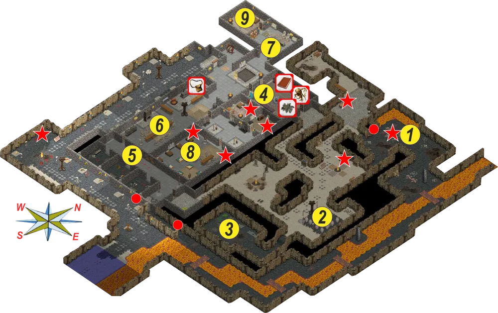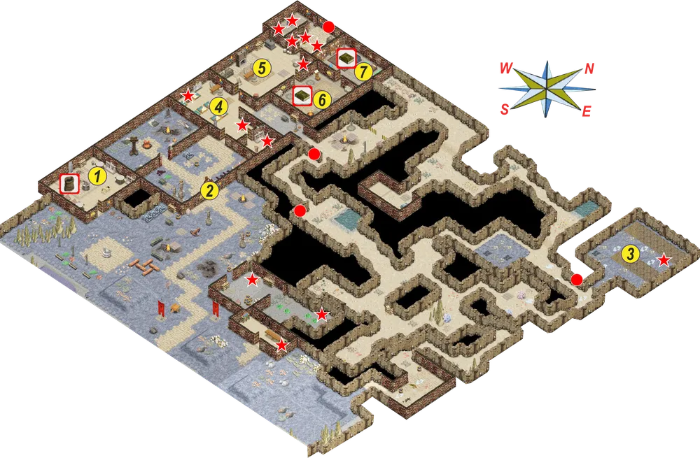 1 – логово дрейка. 2 – кладбище. 3 – логово гигантов. 4 – лаборатория. 5 – ловушка в полу. 6 – столовая. 7 - командир тайного форта. 8 – казарма. 9 – покои командира.