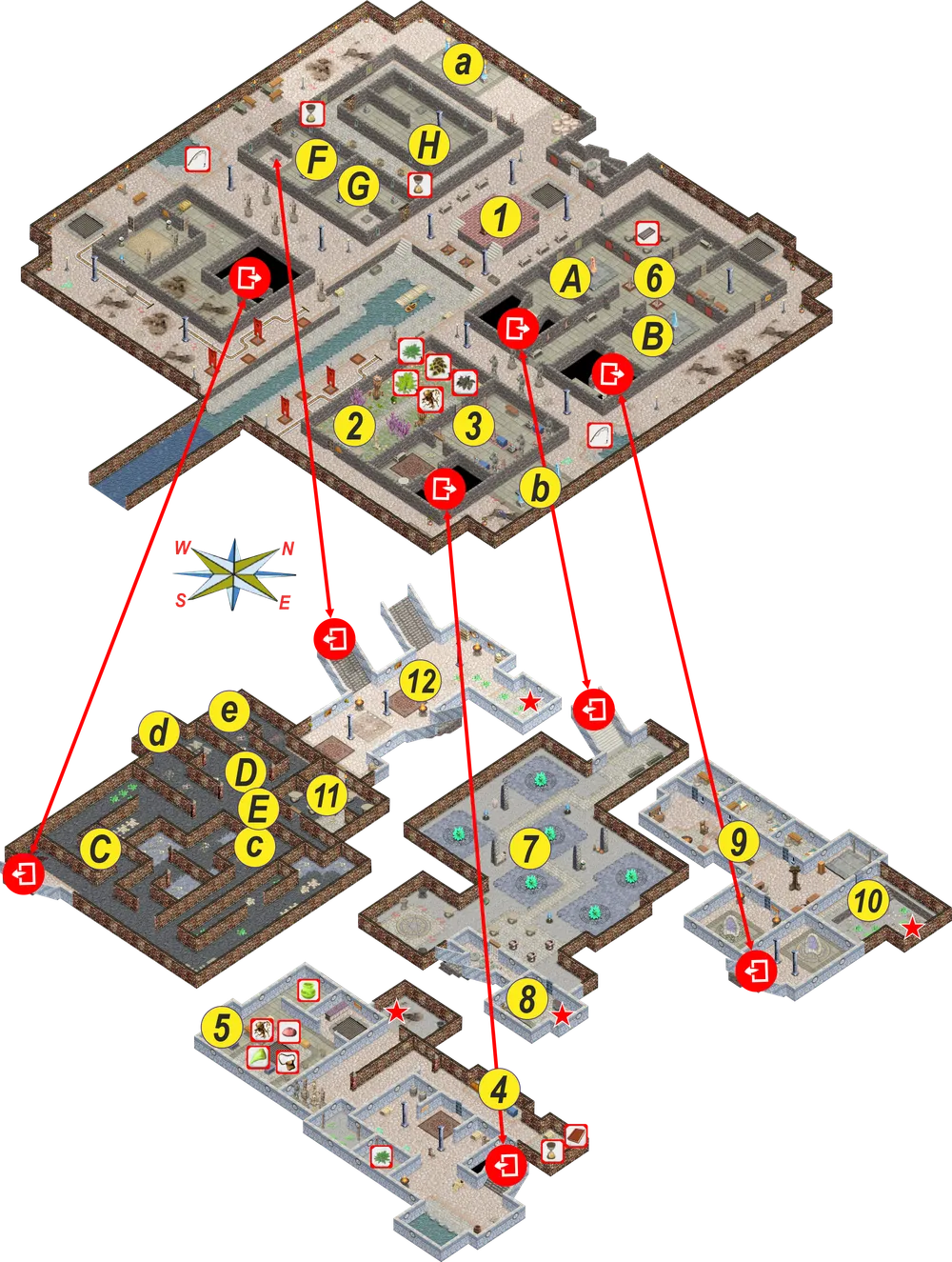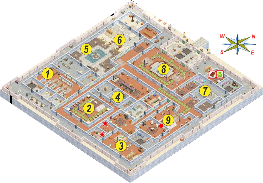 1 – холл. 2 – алтарь. 3 – центральный коридор. 4 – ворота. 5 – рычаг. 6 – комната статуи. 7 – задняя комната.