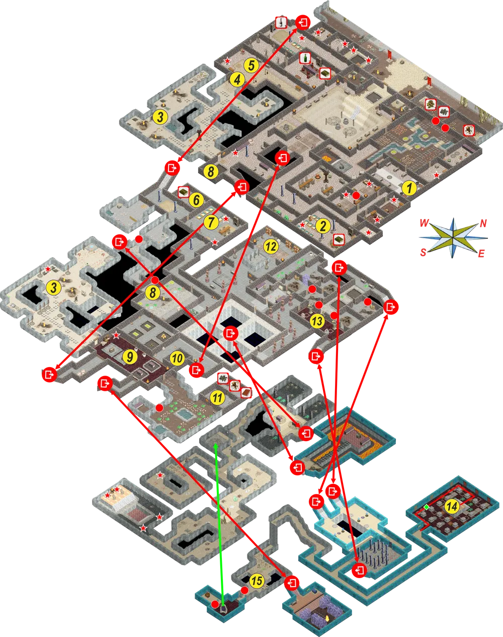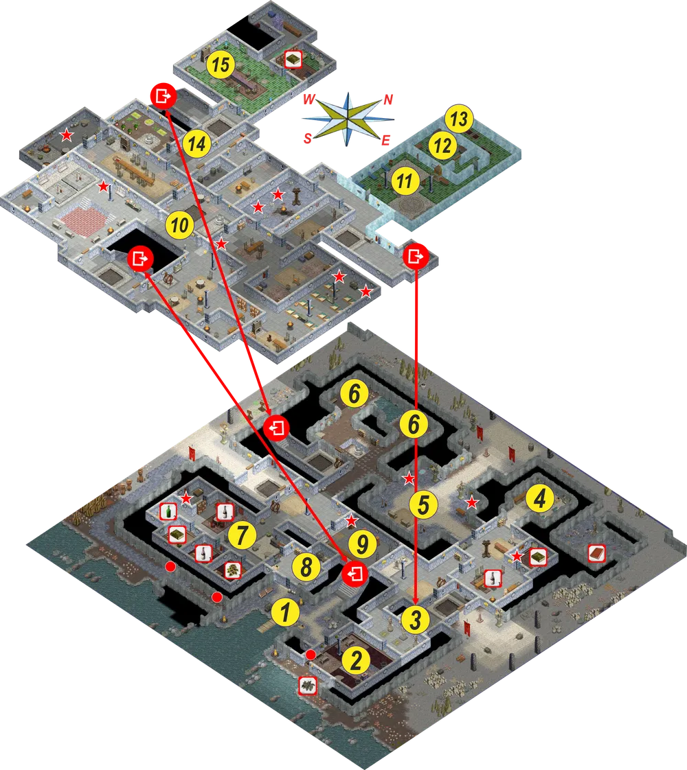 1 – причал. 2 – часовня. 3 – заблокированная лестница. 4 – кухня. 5 – главный двор. 6 – загон для ящеров. 7 – столовая. 8 – кладовая. 9 – арсенал. 10 – дверь. 11 – покои посланника. 12 – записи. 13 – лебедка. 14 – руны. 15 – Лимончелли.