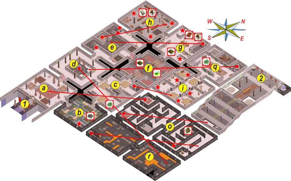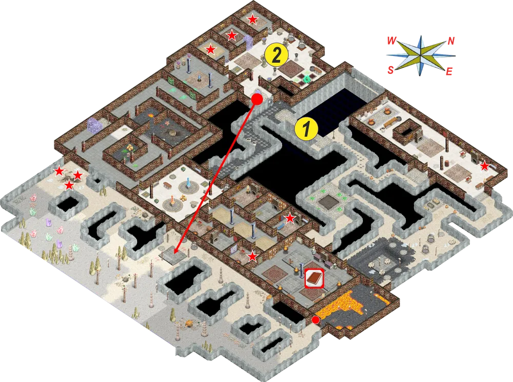 В центральном коридоре вам предстоит схватка с пятью рубиновыми скелетами, охраняющими его. Пробившись сквозь них, вы увидите, что ворота на западе, за которыми расположены личные покои, закрыты. Придется отправиться на восток, где находится лабиринт кабинетов. Обойдя его, рано или поздно вы выйдете к рычагу, открывающему ворота. Когда вы повернете его, то услышите звук открывающихся ворот на западе, а также рык, доносящийся оттуда. В лабиринт ворвутся пещерные демон, огры и лавовые летучие мыши, сквозь которых вам придется пробиться к воротам.
