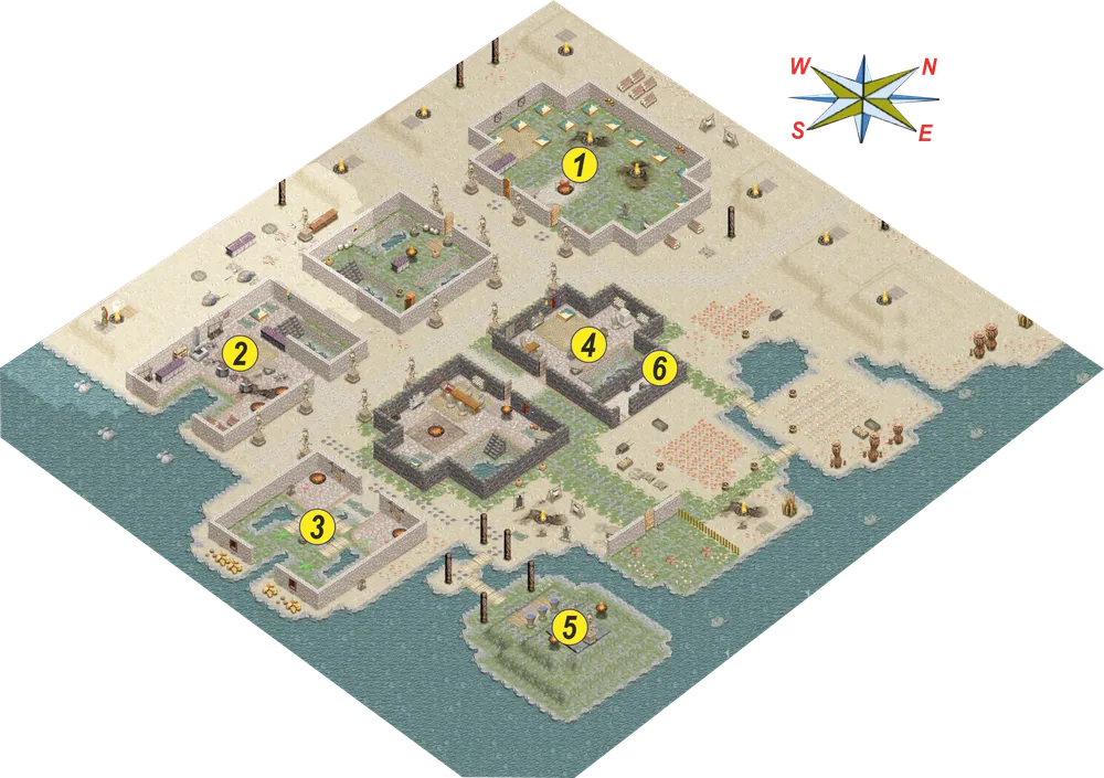 1 – общая комната. 2 – кузница Орхо. 3 – инкубатор. 4 – покои Патасса. 5 – святыня слитов. 6 – магический том.