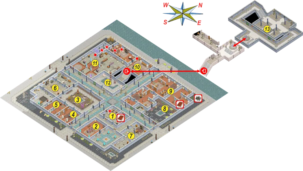 1 – гостевые комнаты. 2 – Патрик. 3 – Хатфиса. 4 – Джулз. 5 – капитан Рабин. 6 – кухня. 7 – казарма. 8 – Кохран. 9 – библиотека. 10 – кабинет Патрика. 11 – Джейд. 12 – фонтан. 13 – Убийца демонов.