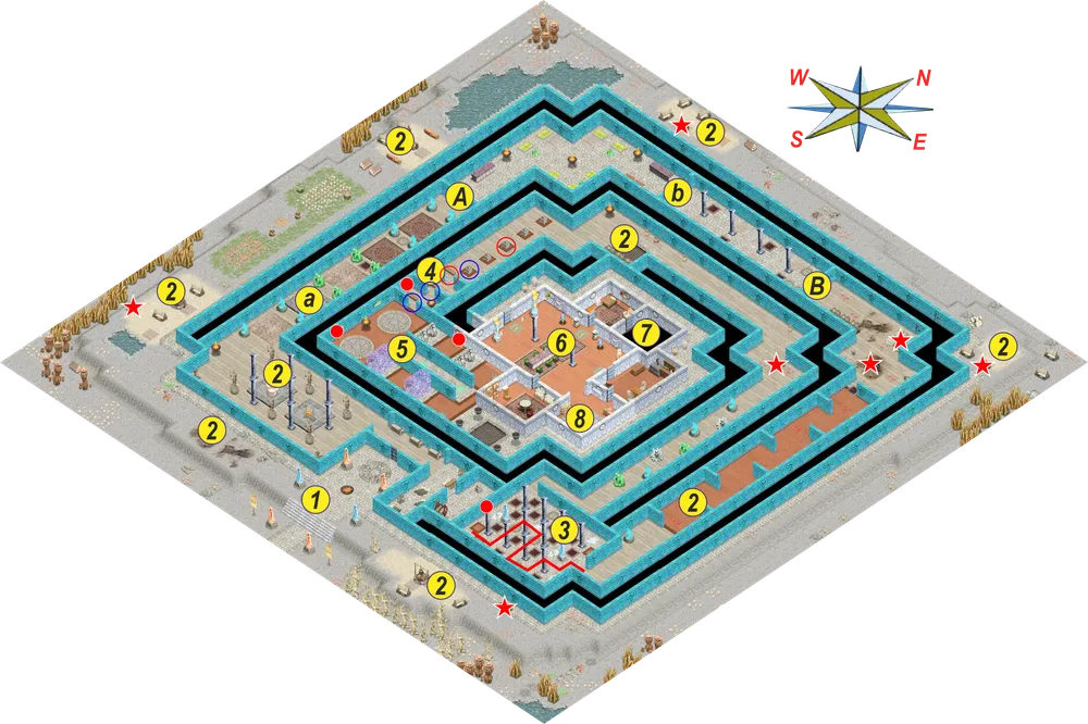 1 – место вашего появления у башни при первой телепортации. 2 – отряд имперцев. a-A, b-B – пара «рычаг-ворота». 3 – зал с колоннами. 4 – анфилада. 5 – коридор с рунами. 6 – Эрика. 7 – сокровищница. 8 – пилон.