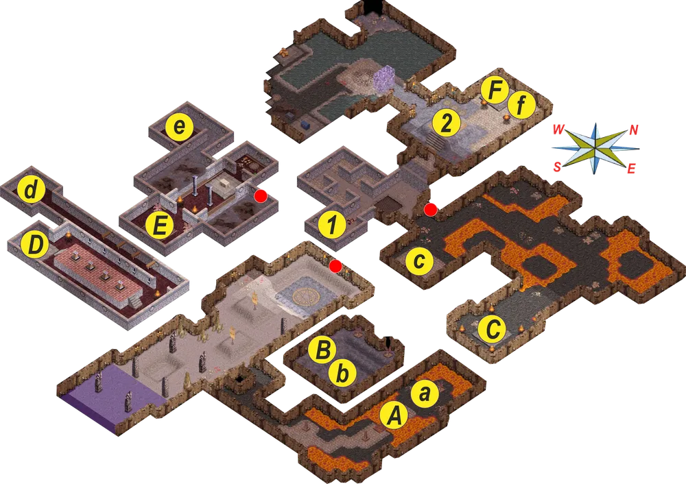 a-f – порталы. A-F – места перемещения. 1 – магический том. 2 – Атрона