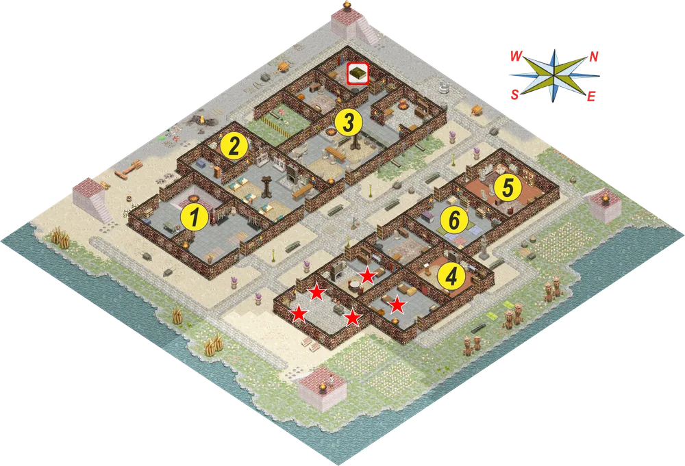 1 – кузница. 2 – капитан Энтони. 3 – таверна «Готовый клинок». 4 – Делария. 5 – Рени (торгует навыками Знание пещер и Первая помощь). 6 – магазин Сюзанны.