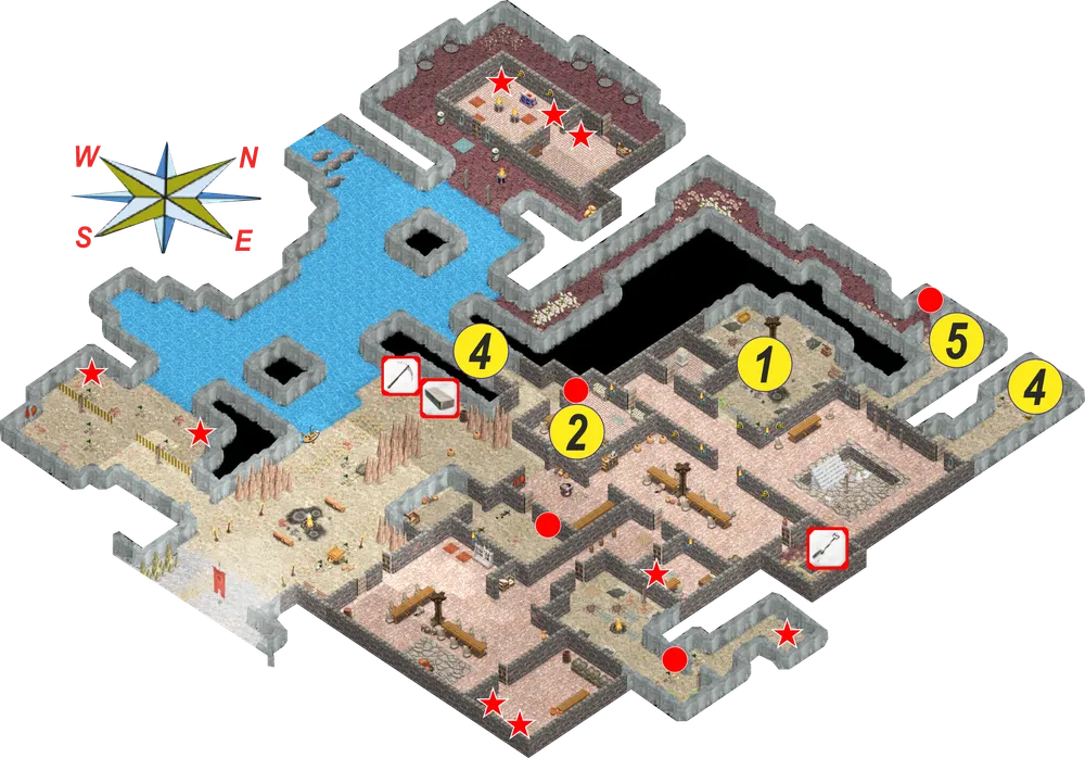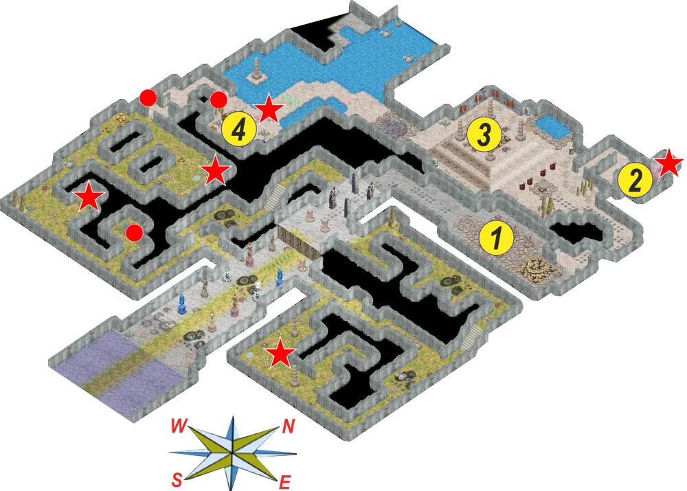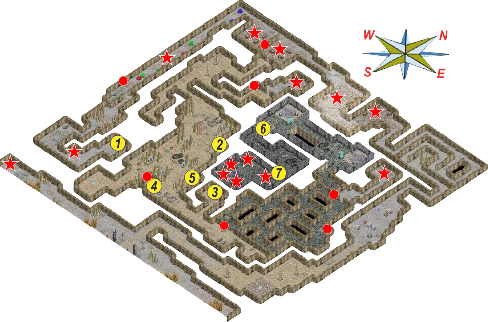 1 – земляные големы. 2 – заклинание Замедление. 3 – Атрон. 4 – сокровищница. Звездами показаны контейнеры, кругами обозначены скрытые кнопки.