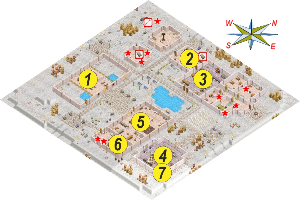 1 – Элмер. 2 – кухня таверны. 3 – таверна. 4 – церковь. 5 – магазин. 6 – мельница. 7 – Бернар. Звездами показаны контейнеры.