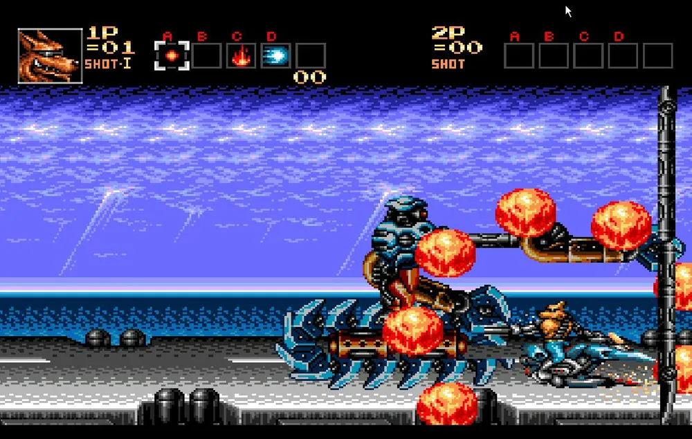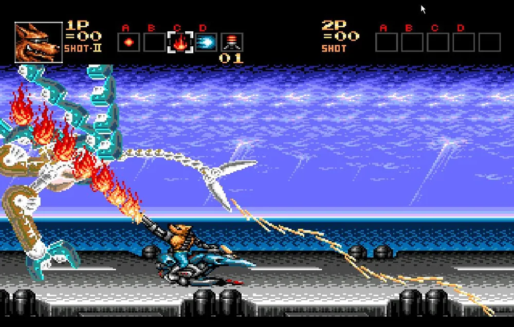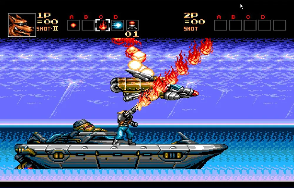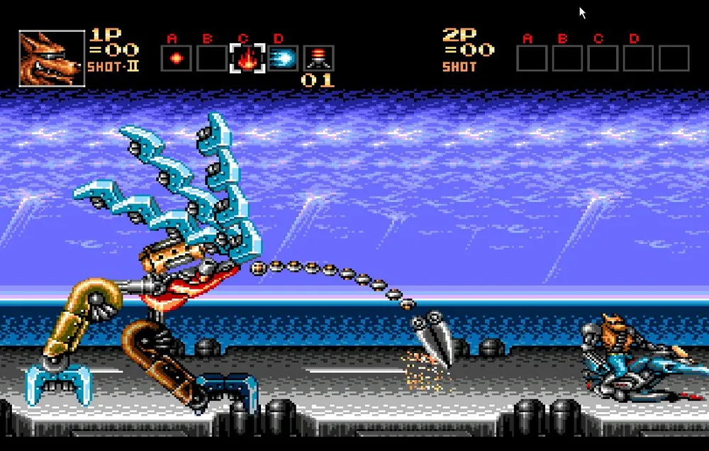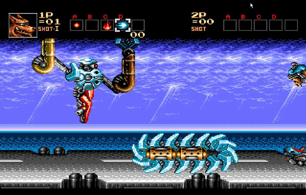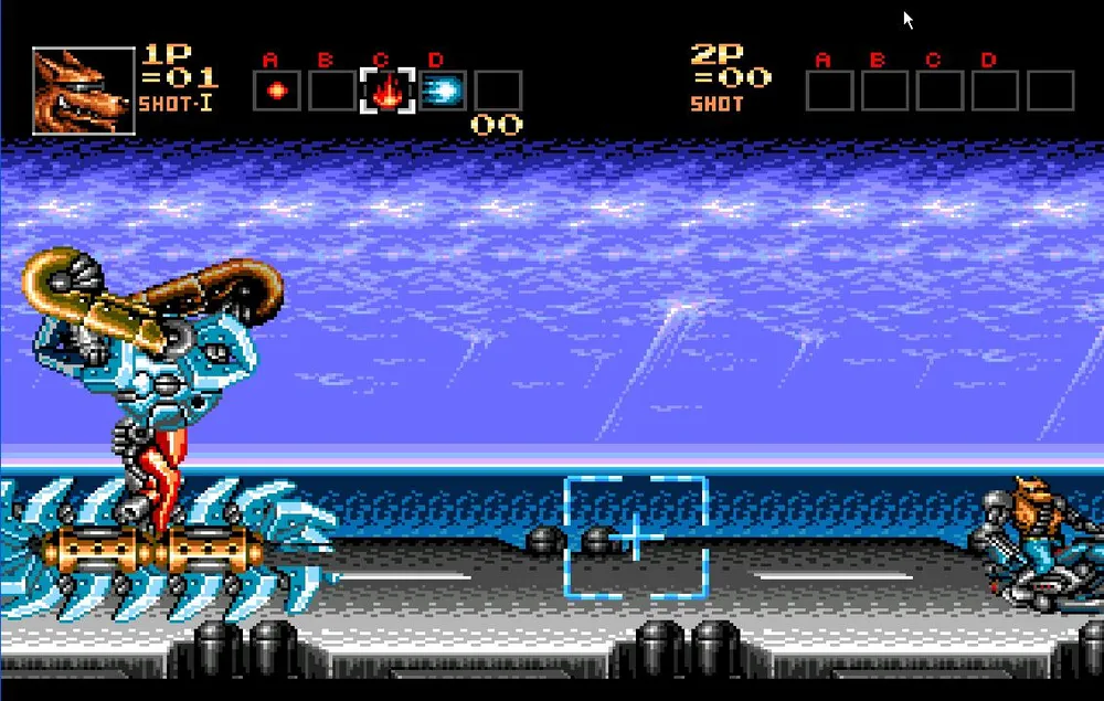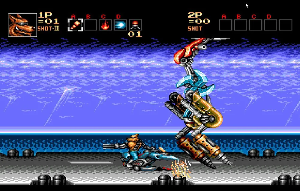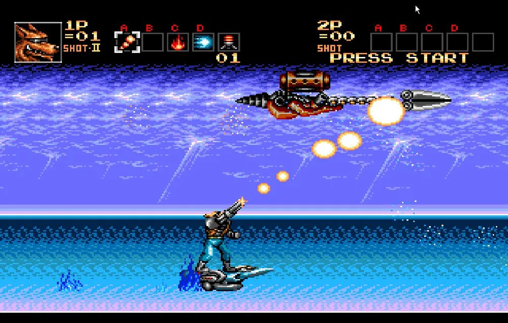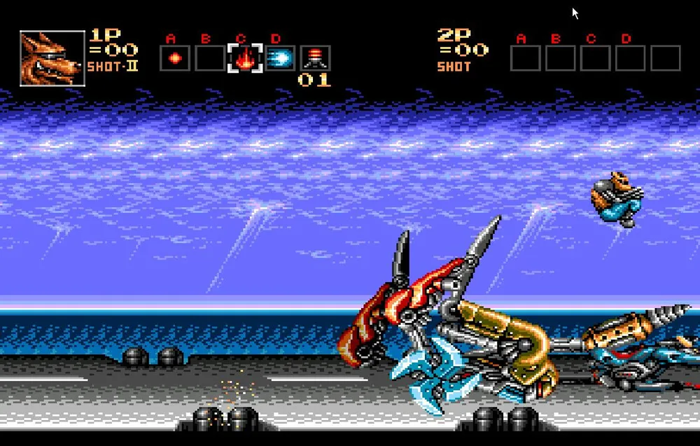 Как только вы разделаетесь и с этим противником вам предстоит перебраться на сушу и продолжить движение на том же анти-гарвитационном мотоцикле, но уже в сухопутной вариации. Сразу же уходите в правый угол экрана. Тут вас нагонят все три робота, которых вы только что подбили и соединятся в одного большого.