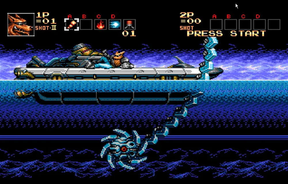 Следующий противник будет по сложнее — это подводный робот. Большую часть времени он просто плавает под водой, как небольшой механический осьминог. Тут вам лучше перейти во второй режим стрельбы и просто стрелять по нему, не сходя с места.