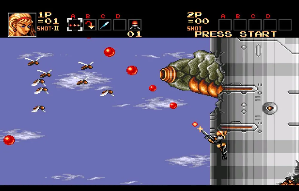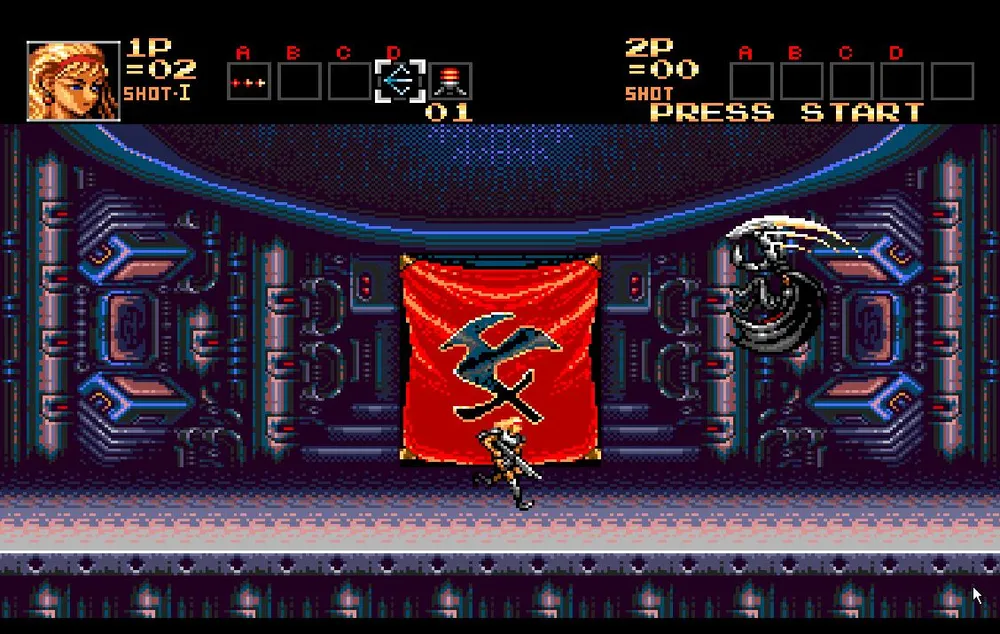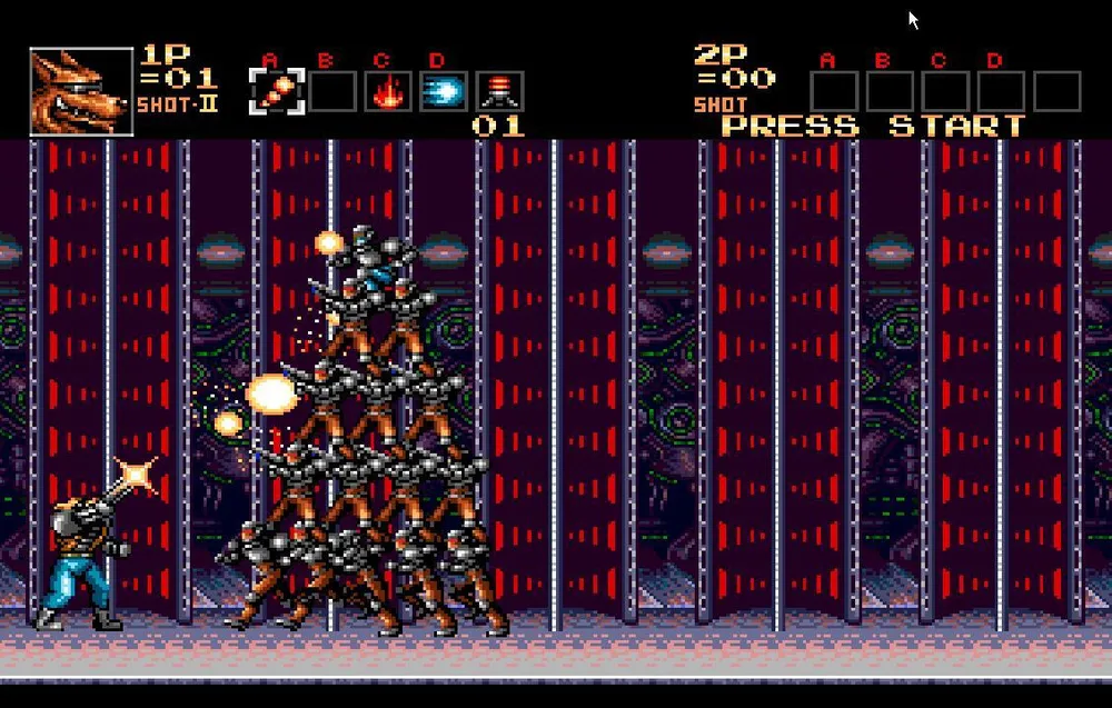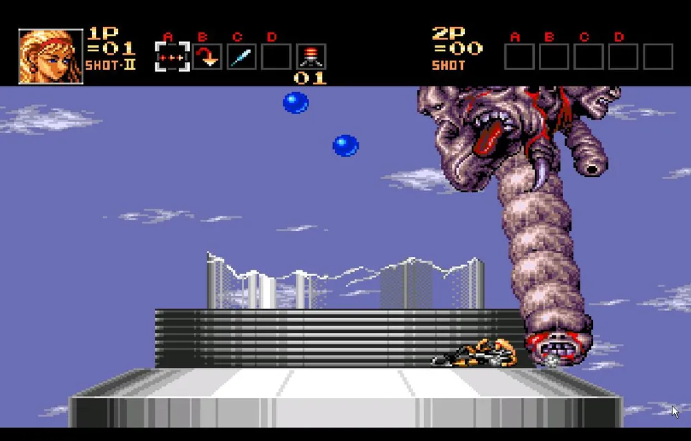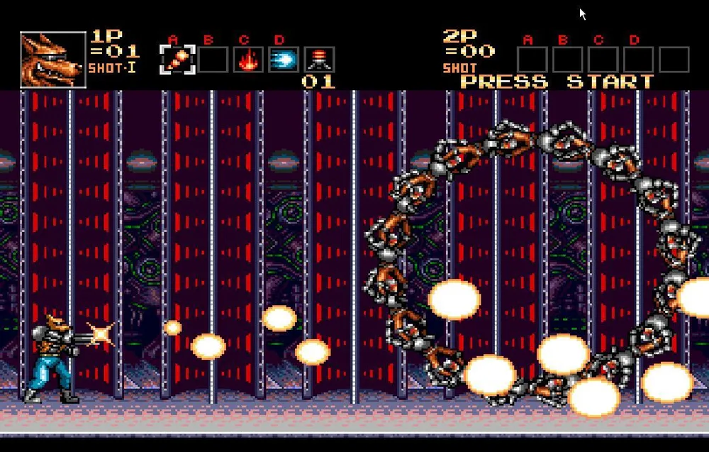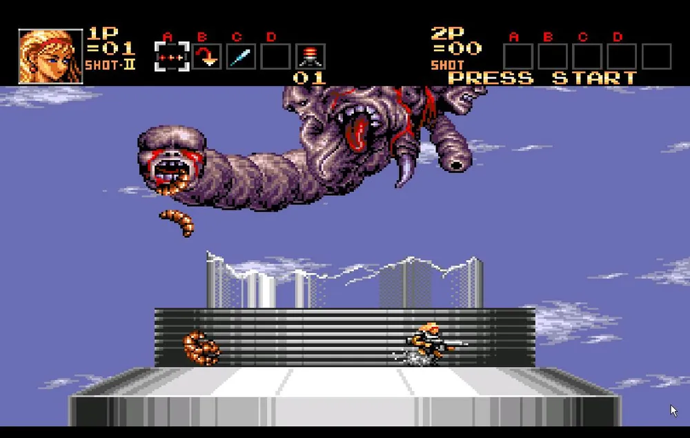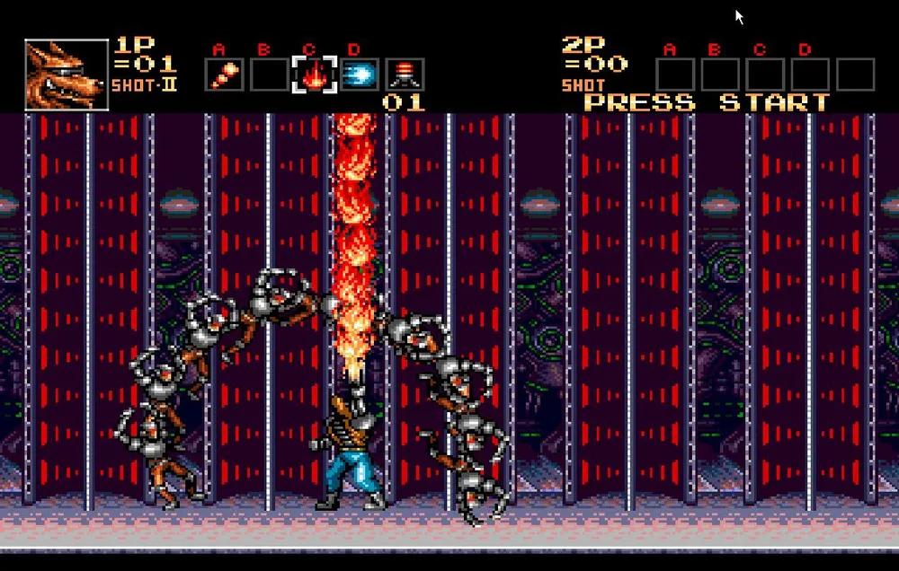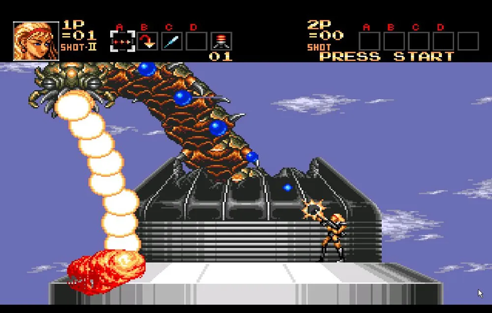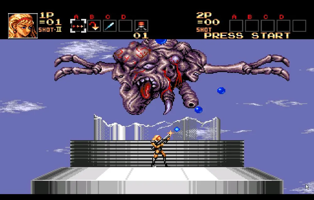 Однако, валить его все-таки придется. Сначала это творение просто попытается вас протаранить пробежав из стороны в сторону несколько раз. Перепрыгнете или уклонитесь подкатом, стрелять в мутанта пока бесполезно. После этого он остановится и у него вырастут здоровые, высокие шипастые ноги после чего он начнет прыгать по экрану, выпускать струю огня и стрелять очередью из шести пуль. Сложность состоит в том, что его уязвимое место находится под бутоном и закрыто его ногами, через которые большинство пуль не пролетает.