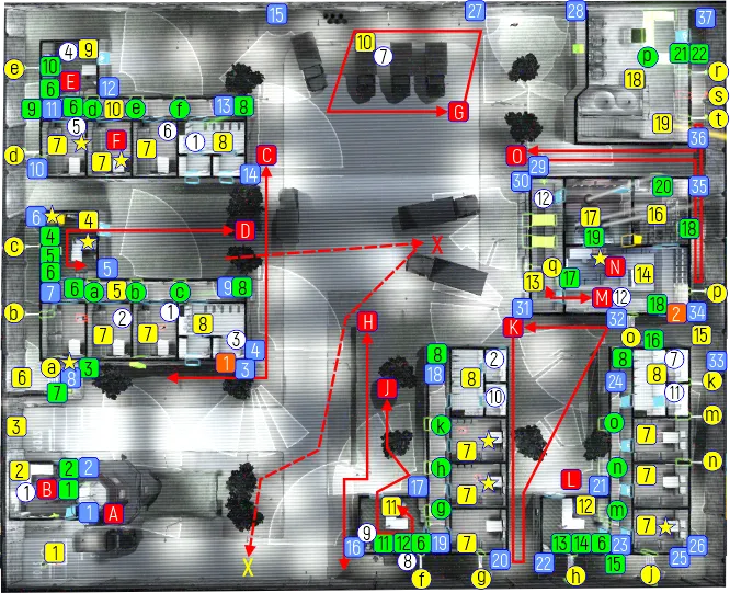 А-О – охранники; линиями со стрелками показаны их маршруты. Зелеными квадратами показаны выключатели. Голубыми квадратами показаны камеры слежения. Белыми кругами показаны вещи. Зелеными кругами показаны шоковые панели.Оранжевыми квадратами показаны воздухозаборники и вентиляционные шахты. Звездами показаны контейнеры с добычей.