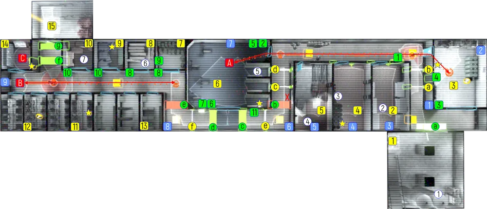 1 – лестница (место вашего появления). 2 – бокс В. 3 – бокс А. 4 – бокс С. 5 – бокс D. 6 – спортивный зал. 7 – бокс F. 8 – бокс G. 9 – бокс H. 10 – бокс J. 11 – бокс K. 12 – бокс L. 13 – бокс М. 14 – пост охраны. 15 – блок аварийных генераторов.