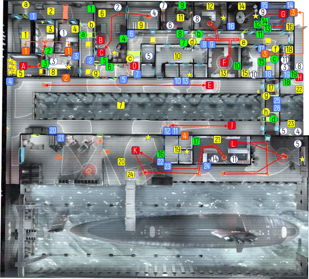 А-L – охранники; линиями со стрелками показаны их маршруты. Зелеными квадратами показаны выключатели. Голубыми квадратами показаны камеры слежения. Белыми кругами показаны вещи. Зелеными кругами показаны шоковые панели. Оранжевыми квадратами показаны воздухозаборники и вентиляционные шахты. Звездами показаны контейнеры с добычей.