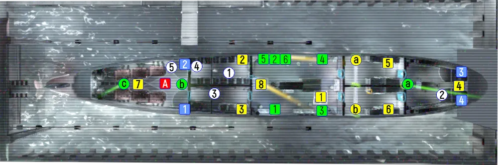 А – матрос.Зелеными квадратами показаны выключатели. Голубыми квадратами показаны камеры слежения. Белыми кругами показаны вещи. Зелеными кругами показаны шоковые панели.