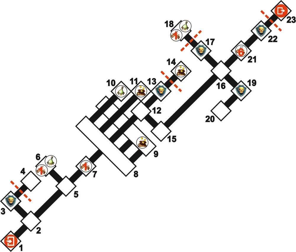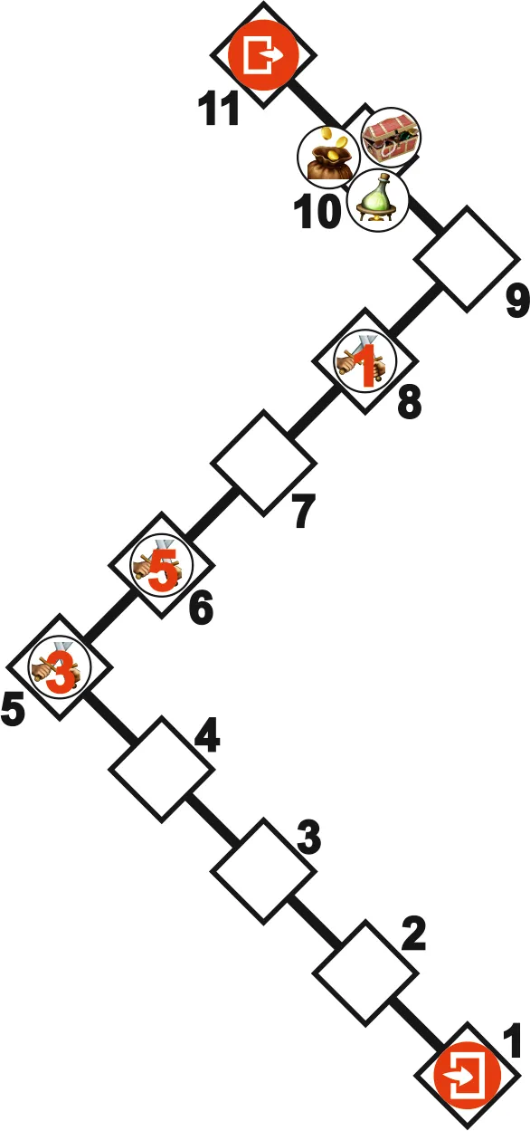 3. В этом коридоре из секретного прохода появится палач, нанесет удар по вашим героям, которые стоят ближе к нему. Удары палача наносят урон в 3 НР. После этого палач скроется в секретном проходе.