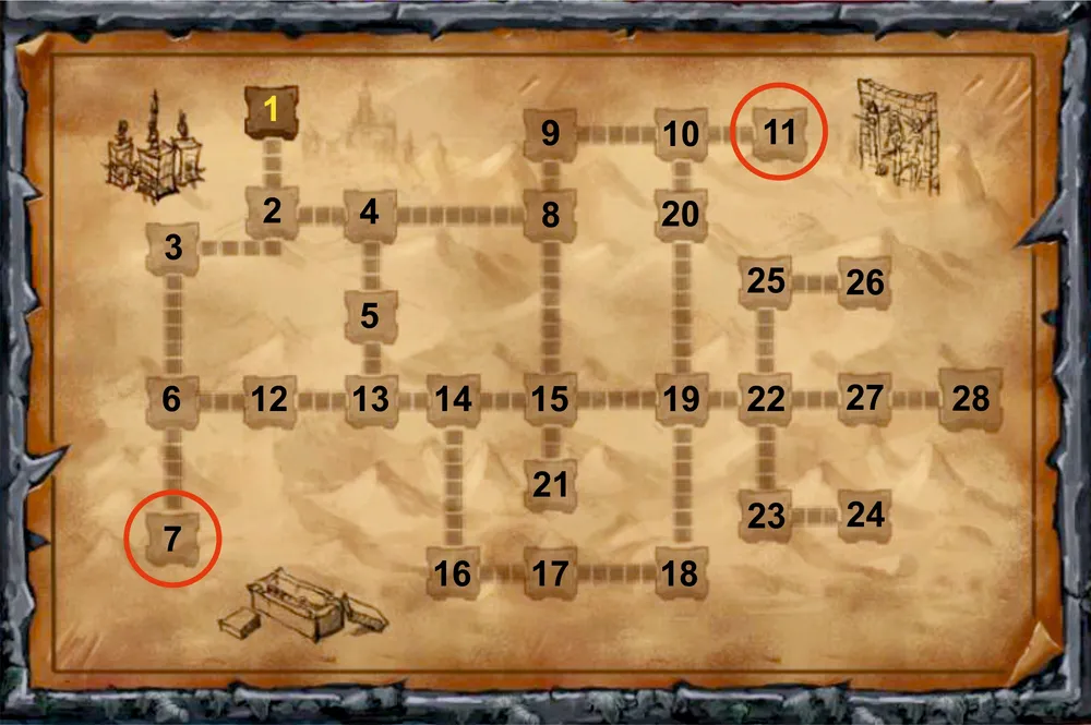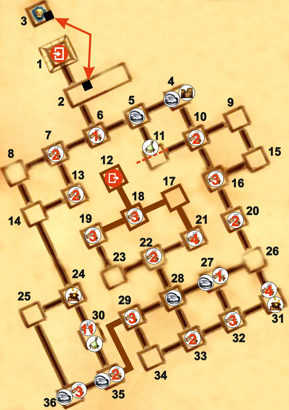 1. Начало миссии. Когда вы появитесь в этой локации, один из ваших персонажей скажет, что у него есть ощущение того, что никто не сможет выбраться из этого замка. Поскольку целью этой миссии является поиск последней части талисмана, то нет необходимости посещать каждую локацию этого подземелья, которое кишит врагами. Наиболее оптимальный путь к локации с третьей частью талисмана такой: 1 – 2 - 6 – 5 - 11 (забрать магический сосуд) – 7 – 8 – 14 – 24 – 25 – 36 – 35 – 29 – 28 – 22 – 23 – 19 – 18 – 12.