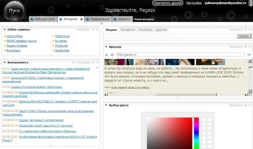 Если же вас это не смущает, а ваша сегодняшняя домашняя страница не столь идеальна, как хотелось бы, то явно стоит приглядеться к этому сайту: браузер в браузере, файловая помойка, любые RSS, виджеты для веб-мастеров, мониторинг сразу двух-трёх почтовых ящиков, возможность создать несколько стартовых страниц и переходить между ними (для работы, для новостей, для развлечений…) и всё это с таким количеством настроек, что хоть вешайся. Всё перемещается, закрепляется, перекрашивается, увеличивается и уменьшается — подстроить под себя можно почти что идеально.