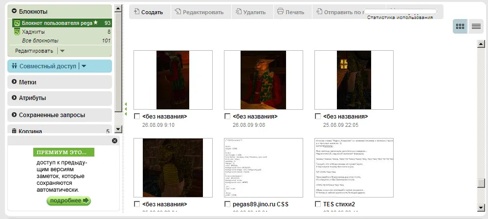 Сервис для создания заметок. Записная книжка, цитатник, ежедневник, место для хлама «к размышлениям», вырезки из статей — огромное количество возможностей использования. Реализация — через веб-интерфейс, программу, плагин для браузера (Chrome, Firefox). Самый многофункциональный вариант — это, конечно, программа. Все записи категоризированы по дате создания, по тегам и/или папкам, созданные пользователем. По нажатию на кнопку Prt Sc появляется возможность выделить часть экрана и записать в виде изображения.