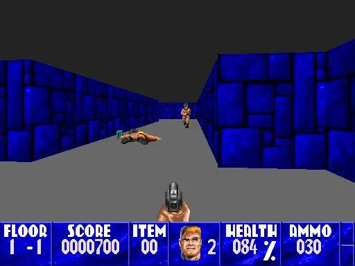 Внутренняя же обстановка замка была сурово прагматичной. Никаких излишеств, лишь стены, деревянные столы, такие же стулья. На стенах, тут и там висели свастика и портеры любимого фюрера, иногда попадались заржавевшие крюки с давно истлевшими скелетами. А так больше ничего, лишь коридоры и комнаты, комнаты и коридоры. Мы должны были идти по игре без карты, поэтому нужно было старательно запоминать каждый вход и выход, каждый поворот, и каждую дверь. Очень хорошо, в ориентировании помогали трупы убиенных врагов: по их распростёртым по полу силуэтам можно было догадаться, были мы в комнате или ещё нет.