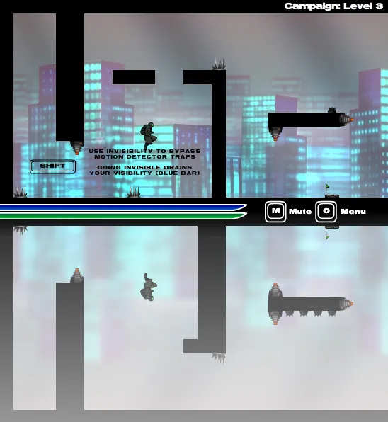 Следующая игра уже не так проста. В Visible 3 мы примерим на себя шкуру специального агента aka Splinter Cell. Набор умений стандартен: можем карабкаться по стенам и потолку, да превращаться в невидимку. Однако, каждый игровой уровень представлен в виде двух слоев, и лишь при наложении мы получаем реальную картину. Накладывать, разумеется придется в голове. В остальном: обычная аркада-платформер.