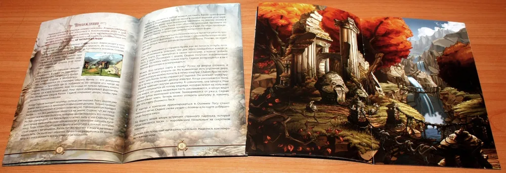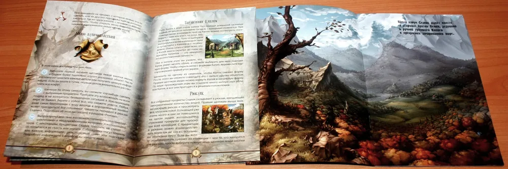 Артбук – семь разворотов с локациями игры. Положив его перед собой во время прохождения, получаешь дополнительную мини-игру: найди отличия между локацией в игре и в артбуке. Да, они немного разные: в игре они адаптированы под паззлы, в артбуке же – чистое художество. Жаль только, развороты расположены не по порядку прохождения, и мини-игра может получиться немного спойлерной. Несколько страниц артбука, и заодно руководства: