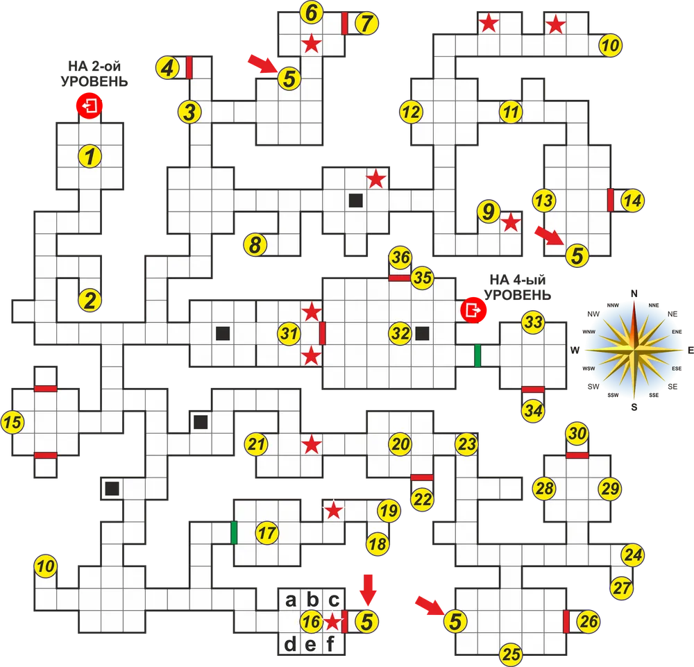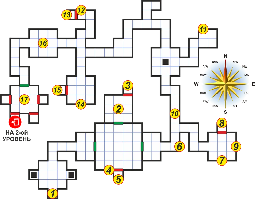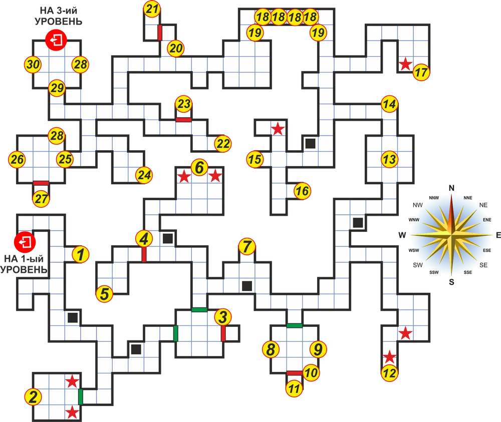 17. Зал рычагов. Поворот этих рычагов открывает потайные помещения. В трех из них прячутся монстры, за юго-западной стеной расположен переход на второй уровень
