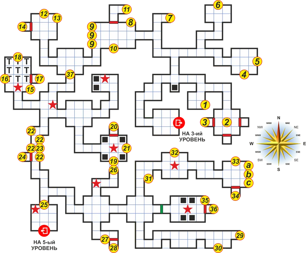 25. Запертая дверь с золотым замком, который отпирается ключом 32. Зайдя в этот зал, вы увидите скелет, лежащий на полу в юго-восточному углу. Стоит вам приблизиться к лестнице, ведущей на пятый уровень, как доступ к ней перекроет дверь, раздастся звук рога, а скелет оживет и нападет на вас. После победы над ним лестница по-прежнему будет недоступна. Чтобы открыть дверь перед лестницей, вам придется заново обойти уровень и перебить всех скелетов, которые появятся на нем (их местоположение показано на карте звездами). Босс скелетов находится в библиотеке (см. Пункт 36). После того, как все скелеты будут уничтожены, снова раздастся звук рога и доступ к лестнице, ведущей на пятый уровень, будет открыт.