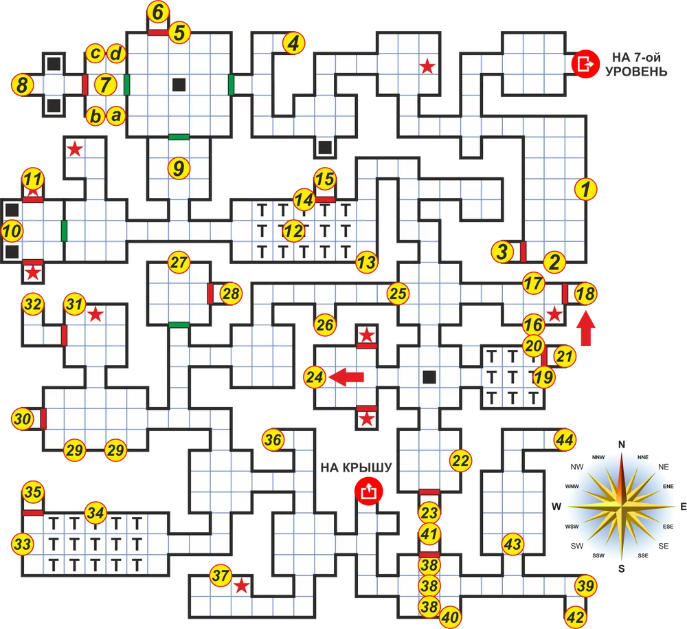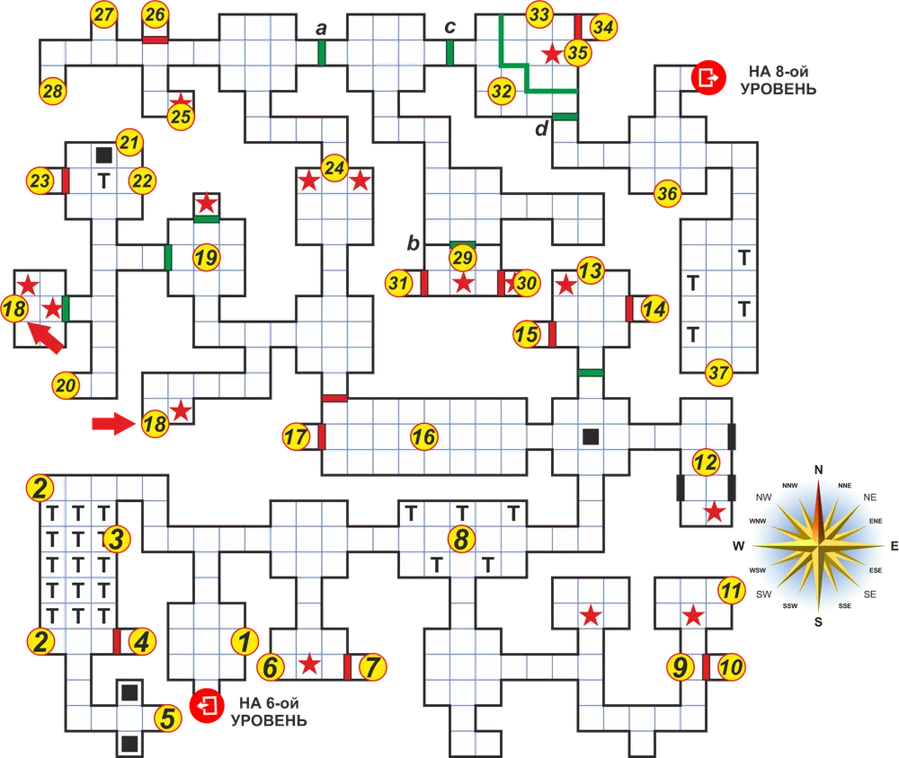 32. Запертая дверь с золотыми замками по обоим сторонам от нее. Отпереть замки можно золотыми ключами (их местоположение на карте показано красными стрелками). Она закроется за вами, когда вы пройдете ее.