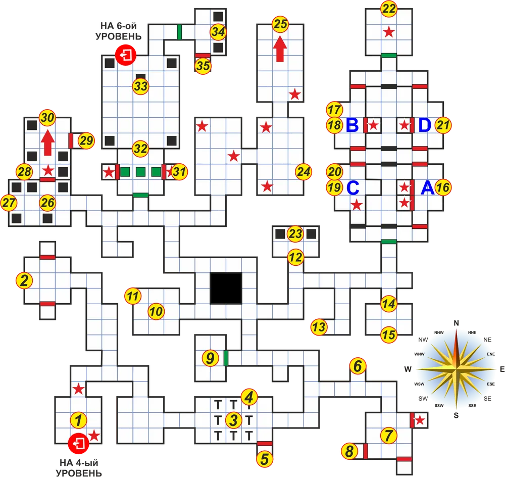 16. Зал рычагов и барельефов. Вам придется повернуть все рычаги (с востока на запад), чтобы открыть дверь на северо-западе и потайную комнату на западе.
