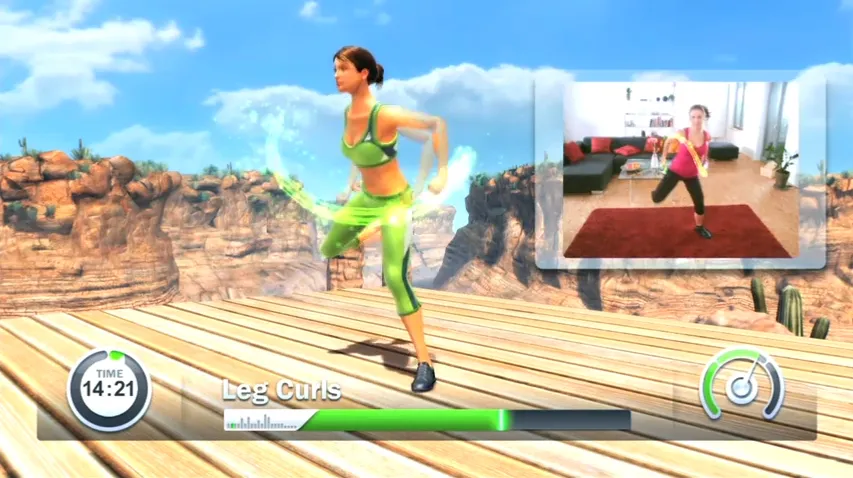 Рассмотрим интерфейс игровой стадии. По центру располагается тренер, выполняющий упражнения. В левом нижнем углу располагается таймер, отсчитывающий секунды до окончания вашей тренировки. По центру снизу располагается панель показывающее: название упражнения, его длительность и интенсивность тренировки. В правом нижнем углу при тренировках с PlayStation Move располагается счётчик бонусных баллов. Справа располагается изображение, передаваемое с камеры PlayStation Eye