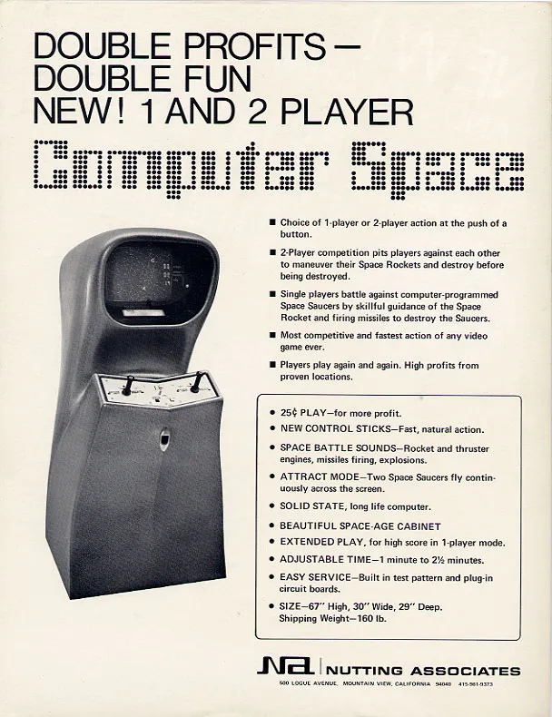 Создатель игры Нолан Бушнелл (спустя год он изобретет легендарный Pong) был вдохновлен еще более древней игрой — Spacewar! для доисторического компьютера PDP-1, весящего без малого полтонны. В ней двое игроков вели бескомпромиссную, хотя и довольно неторопливую ракетную дуэль, будучи привязанными к гравитационному полю звезды. Игра пользовалась огромной популярностью среди студентов престижного Массачусетского технологического института.