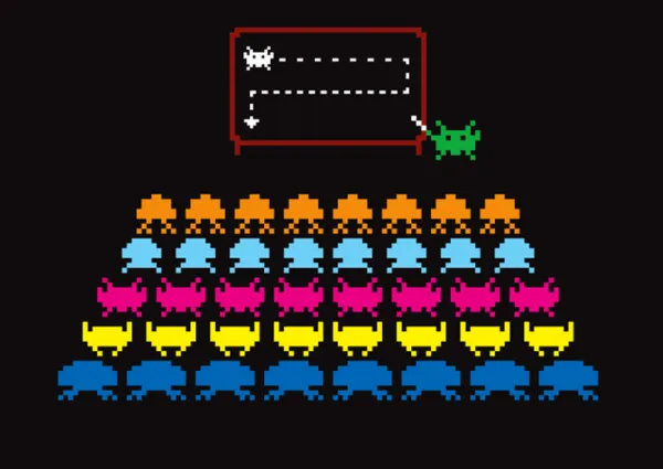Первой «космической» игрой, завоевавшей по-настоящему широкую известность, стала вышедшая в 1977 годуSpace Invaders. Она, пожалуй, знакома каждому, кто интересуется видеоиграми: игрок управляет лазерной пушкой, которая стреляет в инопланетян, сначала медленно, потом все быстрее и быстрее надвигающихся сверху. Можно прятаться за укрытиями – но инопланетные захватчики эти укрытия своими выстрелами быстро уничтожают. Классика жанра Shoot 'em up, вдохновившая неисчислимое множество последователей. Космос, правда, в ней как таковой отсутствовал — то есть был представлен обыкновенным черным фоном.