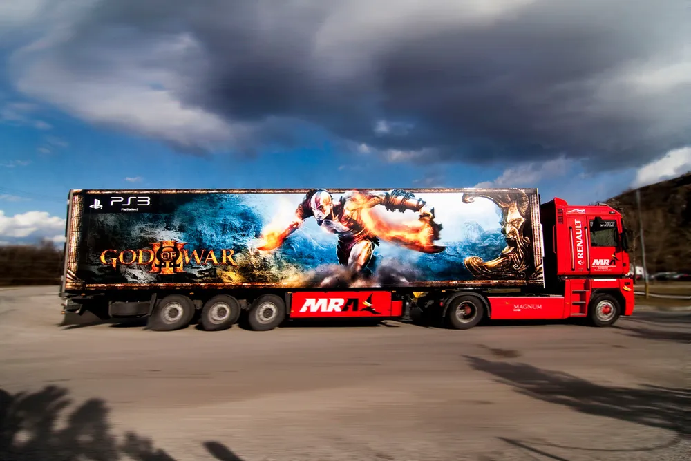Филиалы PlayStation в Чешской республике и Словакии воздают должное этой великой игре, которая проносится через высочайшие балы в обзорах и рекордные продажи на эпическом God of War III грузовике. Разрисованный с обеих сторон, он проецирует 3D изображение Кратоса буквально выпрыгивающего на дорогу в движении.