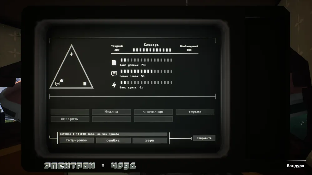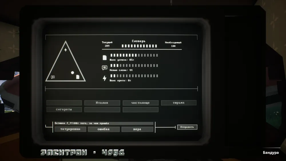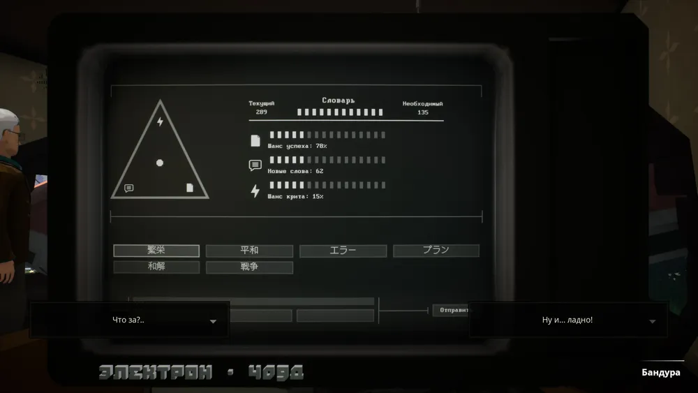 Итак, тарелка врезалась, а никто из неё не выходит. Тем не менее контакт с землянами установлен: инопланетяне модифицировали телевизор Валерия Михайловича и теперь при его помощи можно посылать им короткие сообщения. После этого двери открываются и внутрь заходит человек с надеждой исполнить свою просьбу. Правила довольно простые: всё отображается на трёх шкалах и приводится оценка в процентах того, что сообщение будет правильно доставлено, не искажено и не случится какой-то критической ошибки. Ещё можно регулировать подачу энергии в треугольнике, смещая точку от одного угла к другому. Тем самым усилить эффект от семантического понимания сообщения или снизить риски ошибки. Может быть авторы хотел сначала создать более сложный механизм сообщения с инопланетянами, но в результате имеем такую достаточно простую форму. Самое главное: это выбрать правильные слова из доступного в данный момент набора. Игра даже даёт подсказку: мелким шрифтом ниже прописывается, что должно случиться при заданной комбинации слов.