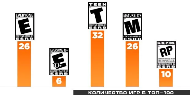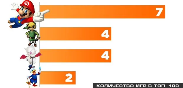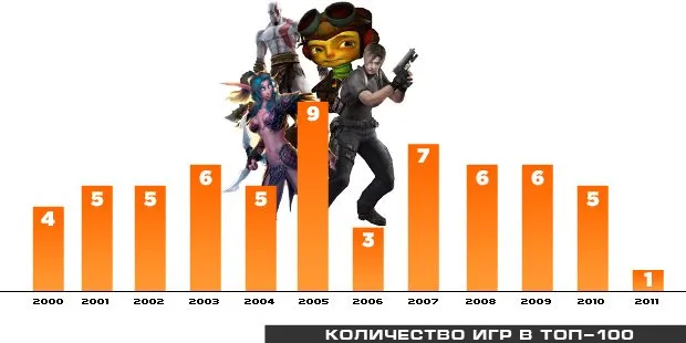 Самый известный и узнаваемый персонаж — вне сомнения, Марио. Усатого водопроводчика знают очень многие, даже те, кто никогда не играл ни в одну компьютерную игру. В топ жанров справедливо вошли RPG, FPS и, неожиданно, платформеры. Сказывается влияние консолей и вообще их популярность на западе. Лучшие игроделы рождаются и работают в Японии. Лучшие игры были выпущены в 2000-х годах (спорно, правда?), а конкретно — в 2005. В этом году появились World of Warcraft, God of War, Resident Evil 4, Gran Turismo 4, Need for Speed: Most Wanted, Psychonauts.