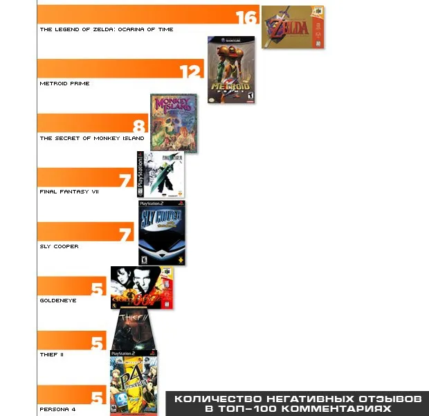 Еще один очень холиварный вопрос — самое спорное/незаслуженно присужденное место в Топ-100 игр. На первое место попала пятая часть похождений Линка, The Legend of Zelda: Ocarina of Time. Хочу пояснить это пункт. До этого голосования на GamesRadar было еще одно, еще более масштабное. Читатели выбирали 100 лучших игр всех времен. Некоторые игры вызвали горячие споры за право вообще находиться в это списке. Ocarina of Time, Metroid, FF VII — как раз из этой серии.