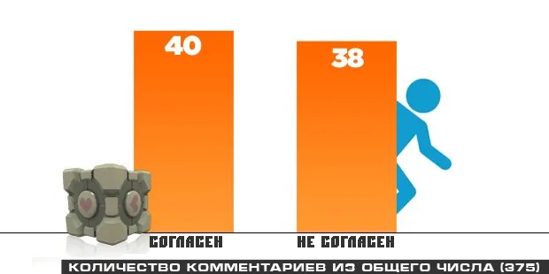 И напоследок, был немного несерьезный вопрос о самой-самой игре. Самой лучшей, самой интересной, самой завлекательной. Этой игрой стал Portal. Читателям даже не дали выбора и просто предложили голосовать «За» или «Против». С очень скромным разрывом в голосах «Портал» стал игрой №1. На эту тему можно долго спорить, у каждого игрока свой личный топ в голове и наверняка есть своя самая любимая игра. Портал, конечно, очень выдающийся продукт. Это был прорыв в игрострое, новый подход в геймплее, огромная ре-играбельность. Но выдвигать какую-либо игру на Топ-1, даже если это Портал, мне кажется, — заведомо провальное решение. Так что не стоит воспринимать это всерьез.