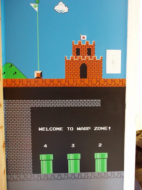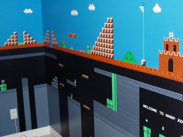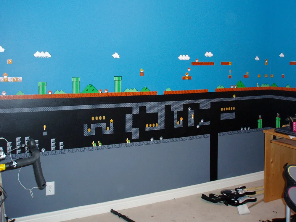...Или же изукрашенные картами миров 1-1 и 1-2 стены одного пользователя Flickr.com. Этот парень в течении 7 месяцев по выходным кропотливо выводил знаменитые облачки и фраги из Марио, медленно и с любовью.