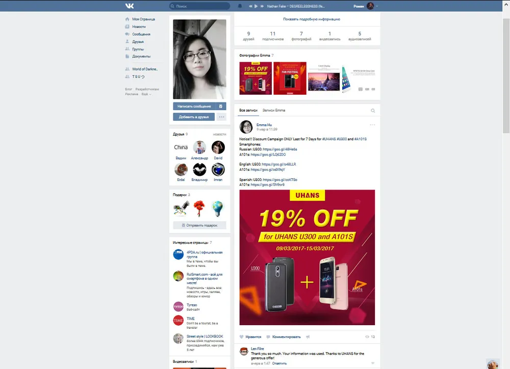 Они никак не связаны между собой если не всматриваться, и даже не знакомы, но между ними есть связующее звено - группа UHANS Mobile! Вероятнее всего они являются купленными аккаунтами для продвижения группы и акций.