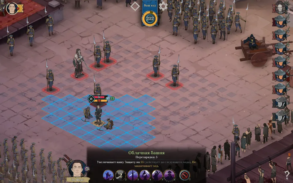 Помимо базовых характеристик, которых определенно не так уж много, у каждого класса имеются умения, в том числе пассивные. Часть из них может быть открыта лишь на определенном уровне, посредством вложения очков умений, по одному за каждый уровень. Выбор не слишком велик, это вам не D&D. Поэтому зачастую выбор сводится к банальному усилению той или иной из базовых характеристик. Кроме этого в игре имеются артефакты, а у каждого из бойцов по два слота под них. Чаще всего предметы поднимают или занижают базовые характеристики. Один раз мне попался кожаный кошель, что увеличивает награду в золоте за каждый из боев. В этом плане тот же Pyre куда убедительней. Там некоторые из артефактов кардинально усиливали умения и меняли механику их применения.