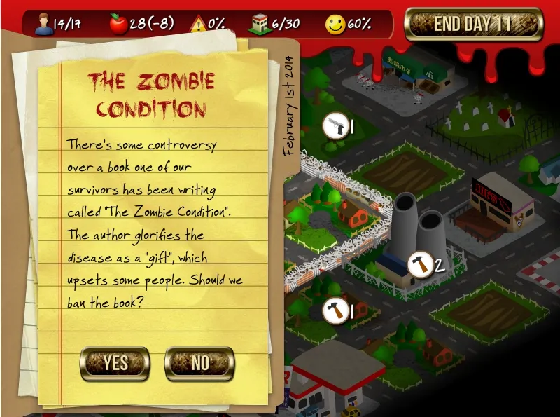 Продолжение симулятора города, заполненного зомби. Все то же, но теперь разработчики решили действовать по принципу "больше, красивее, умнее". Так что теперь у нас появились новые здания, кое-что перерисовано (изображение выживших, например), у ваших людей теперь есть способности и экипировка, добавлена куча абсолютно внезапных и случайных событий, которые случаются каждый день. Кто-то из выживших выпустил книгу, называющую инфекцию "подарком" и восхваляющую зомби, стоит ли ее запрещать? А если не запретите, то не будет ли каких-нибудь последствий? К вам пришел какой-то таинственный доктор - впустить его? Если впустите, то он займет лабораторию на неопределенный срок. И я пока не знаю, что он там исследует. И так везде. Есть, правда, события неизбежные, которые предотвратить не удастся: если кого-нибудь из ваших товарищей укусит зараженная крыса, то выбора у вас никакого не будет. Последствия предсказуемы. В целом игра стала еще интереснее, что не может не радовать, но я все же надеюсь, что разработчики соберутся с мыслями и сделают большую игру, а не флешку. Благо мозгов у них хватит. Подкиньте им уже денег, что ли.