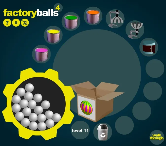 Не совсем новая игра, ну да ладно. Итак, мы имеем: шарики (предположительно 20 штук), краску и кучу всяких полезностей вроде строительных касок или темных очков (а что, разве они не полезны?). Цель - из абсолютно чистого белого шарика сделать такой, который показан на рисунке. И завертелось...