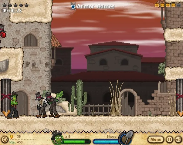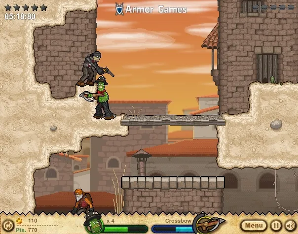 Поначалу играть во все это дико непривычно, противники бегают/прыгают/едва ли не летают, кто-то сам умудряется упасть в пропасть, кого убивает прилетевшими из-за экранама стрелами...В общем, жизнь у наших противников (да и персонажа) короткая, но насыщенная. При этом каждый уровень имеет своих уникальных противников, оружие, да еще и всяческие особенности в придачу, вроде внезапно выключающегося света на уровне с вампиром (боту-то все равно, тем более что он и есть вампир) или постоянно поднимающейся лавы. Или регулярно пролетающего и сжигающего всех неугодных НЛО. В общем, играть весело. И очень обидно то, что в игре всего 15 уровней и с 2010 года она никак не обновлялась. Были бы обновления - можно было бы играть вечность. А так...прошел и забыл, увы.