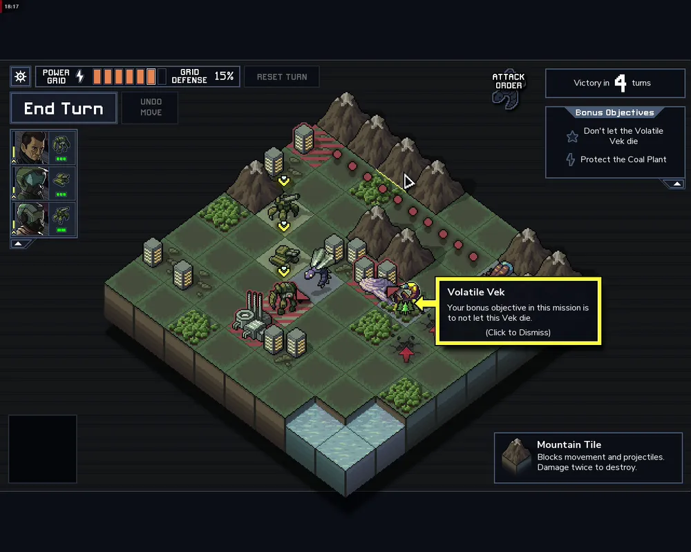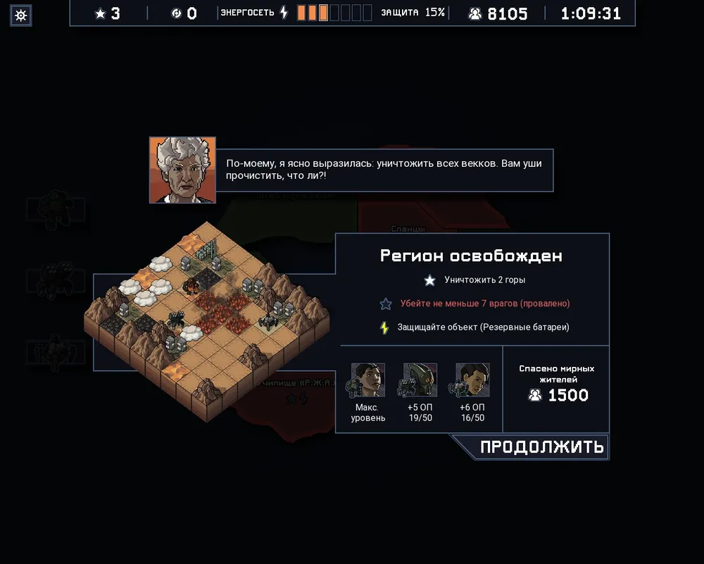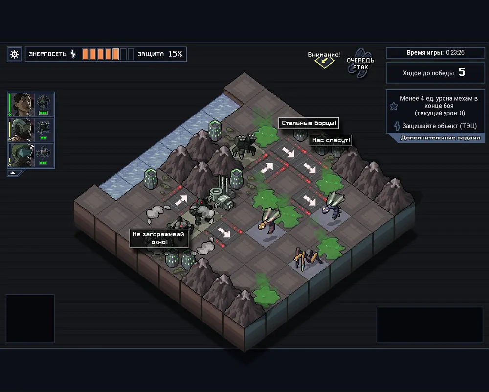 При это убивать всех врагов для того чтобы вам засчитали победу не обязательно. Даже выполнять задания не обязательно. Главное продержаться четыре или пять ходов, не дав веккам уничтожить ваши три боевые машины и не допустив разрушения зданий. Здания особенно важны, поскольку каждый удар по ним убавляет энергию «защитной сети», сдерживающей основные силы векков. И в отличие от мехов, которые восстанавливаются после каждого боя, уровень энергии сохраняется между миссиями и повысить его можно только за выполнение заданий.