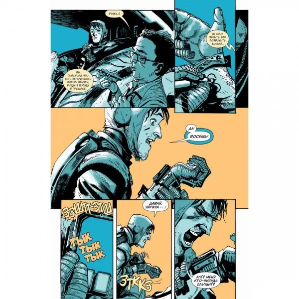 Авторский стиль тоже, между прочим, на любителя. У меня он, например, выбивает ностальгические нотки — попадались мне в девяностых на глаза отечественные комиксы с похожей немногоцветной палитрой и грубоватой штриховкой . Однако кого-то вся эта грубоватость и герои с угловатыми чертами и волевыми челюстями могут и отпугнуть. Да и вообще — мало что ли всяких авторских стилей сейчас?