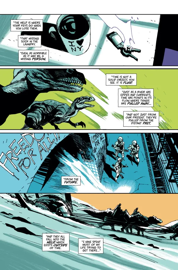 Фиг-вам, как говорится. Профессора хотя бы спасли, но в доисторической эпохе осталась его помощница, которая на последней странице лицезрит весьма странную вещь, явно связанную с «повстанцами» из мелда. И загадка этой связи добавляется к остальным пробелам в истории. Видимо не с проста этот подзаголовок «Часть первая: Чужак». Но где «Часть вторая»? А нет её.