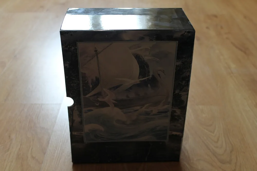 Книжечки пришли упакованными в такую вот коробку, размещаются они в ней очень плотно, и достать отдельно взятую книгу от туда, порой, не так уж просто. :) На стенках упаковки размещены арты из самого произведения. Как по мне, выглядит, довольно таки, стильно.