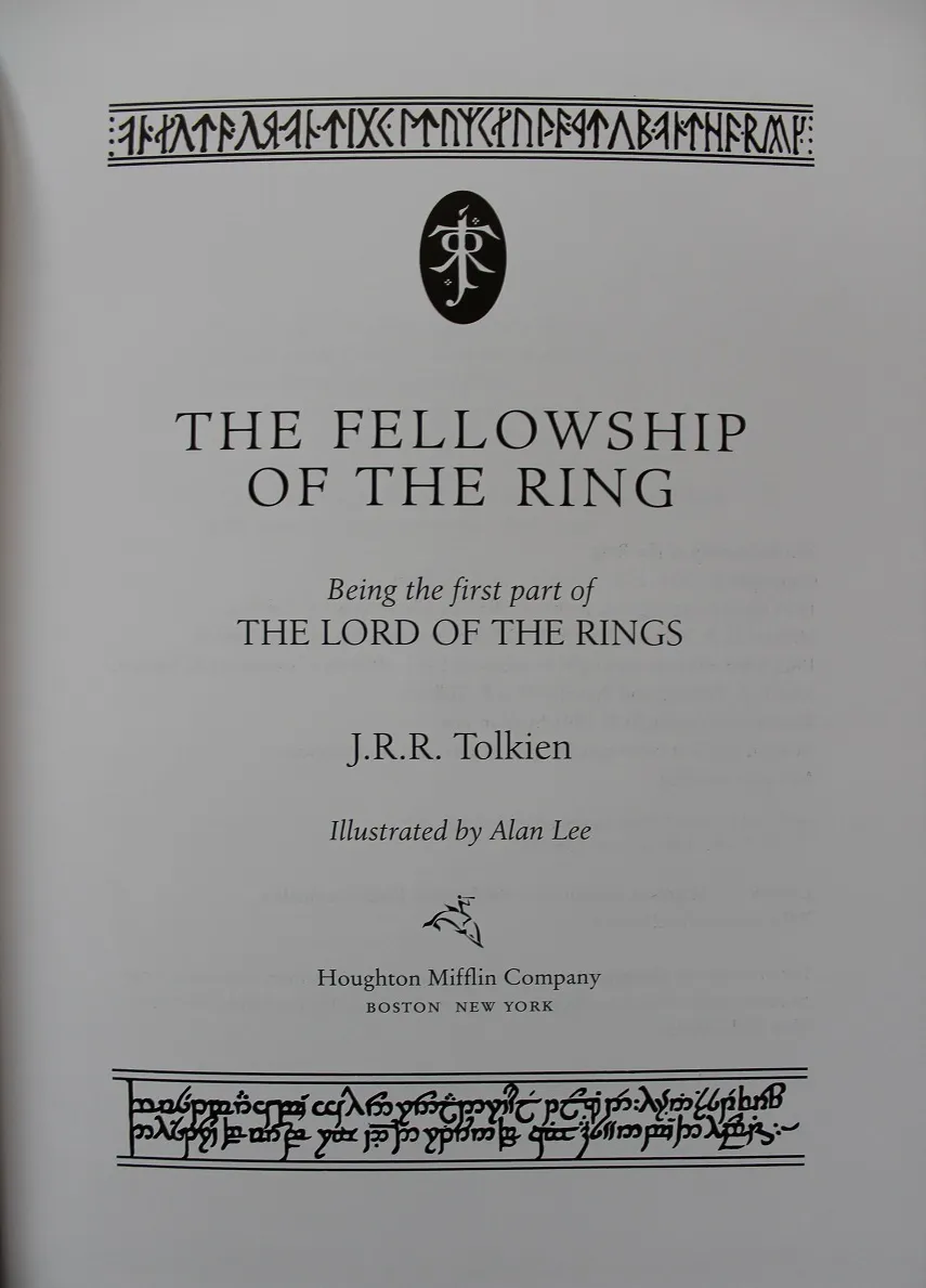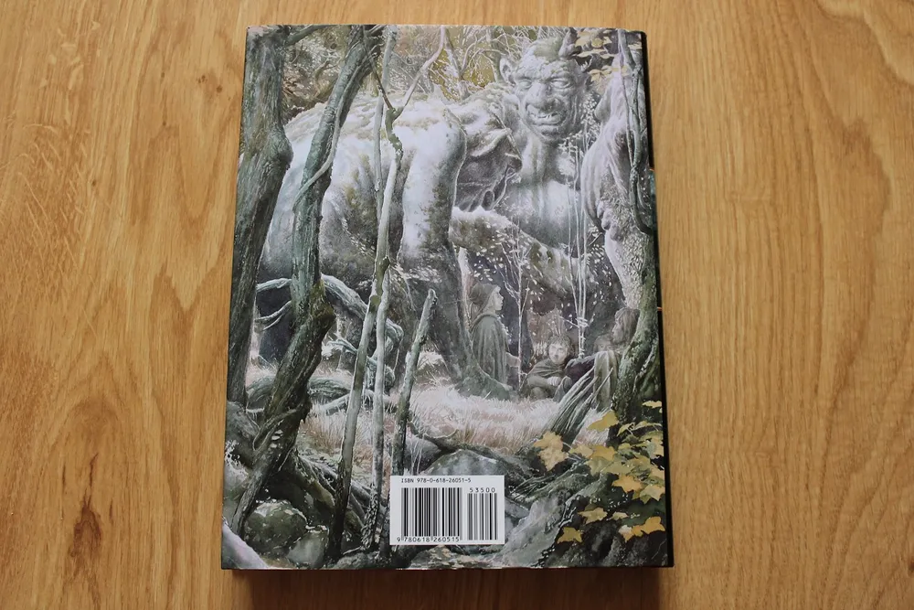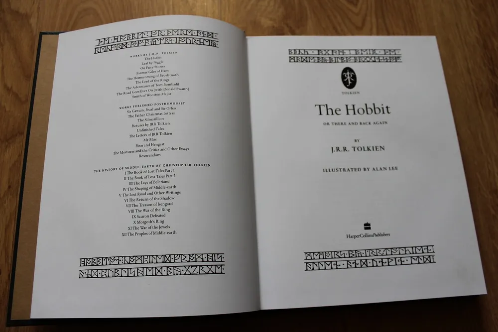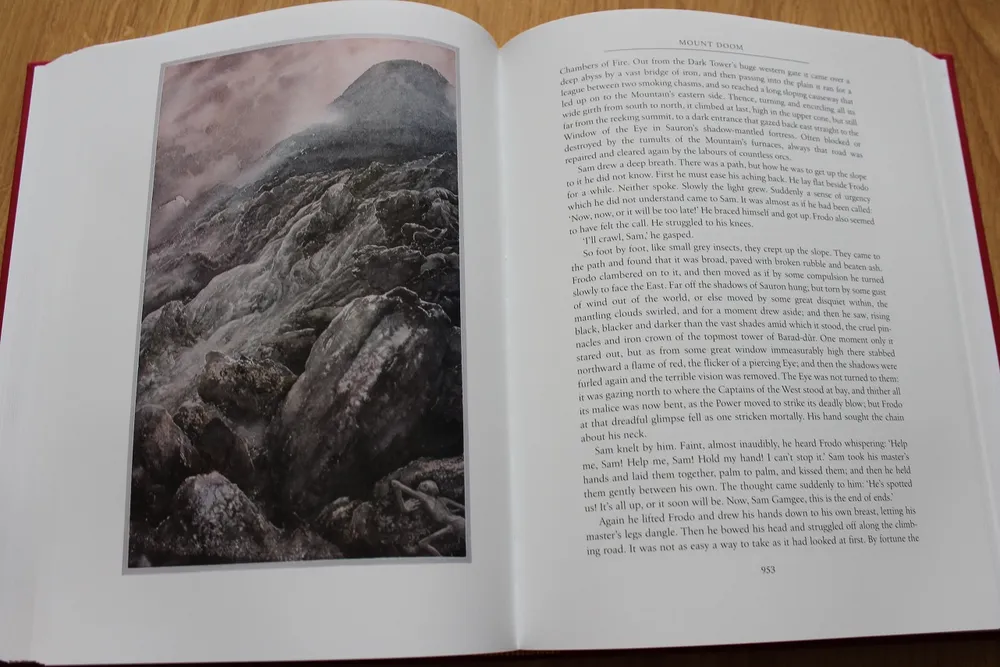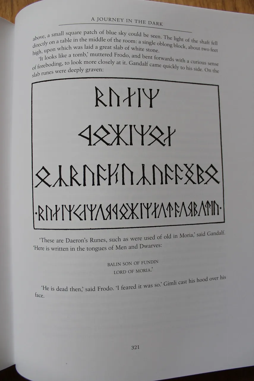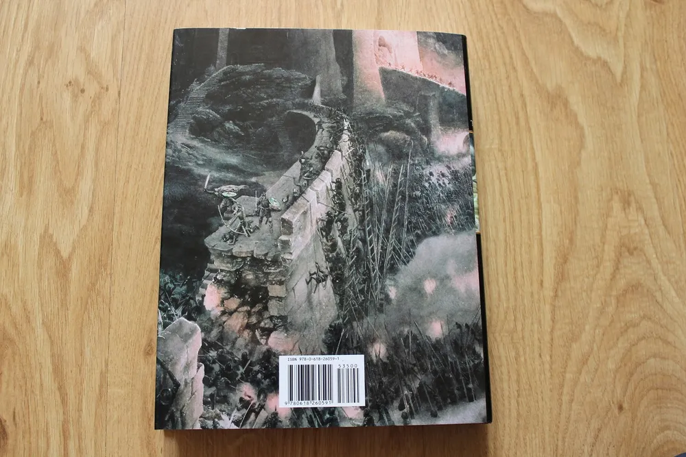 Обложка у них тоже очень твердая, но немного другая, нежели у Хоббита. Целостно, книга выглядит и держится в руках приятнее, чем The Hobbit. На переднем плане книги можно заметить странный знак. :) Когда я записывал видео, для меня он был загадкой, но позже правда открылась мне. Это оказались буквы аббревиатуры сшитые таким чудным образом: J R R T. Страницы в этом издании, по качеству, практически полностью соответствуют Хоббиту, разве что шрифт поменьше.