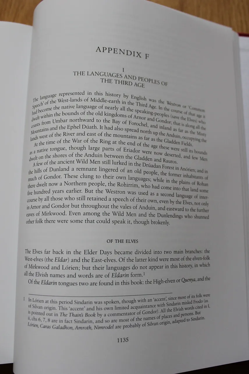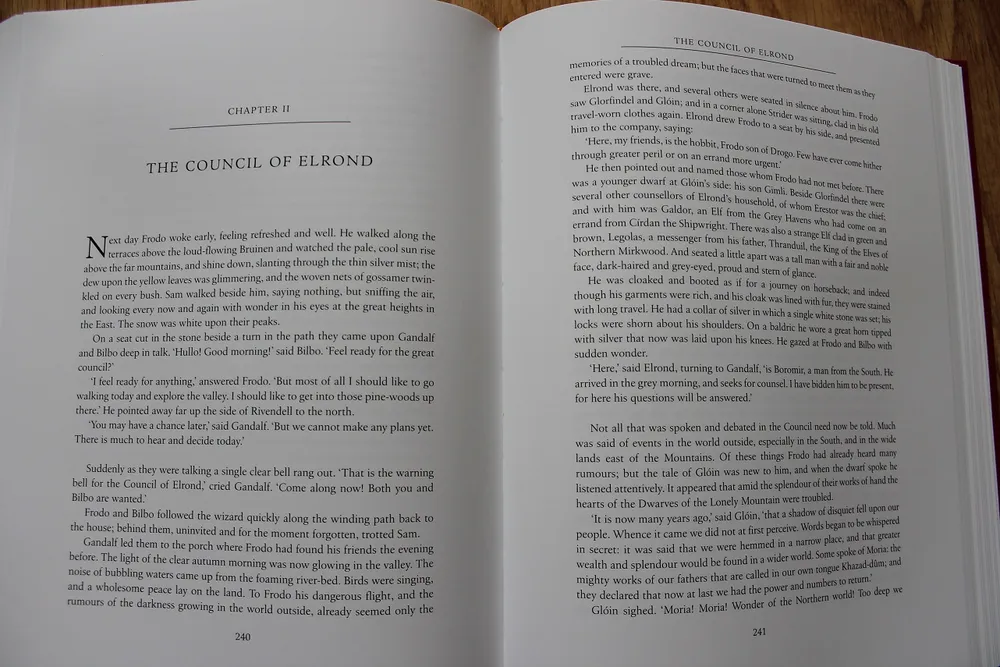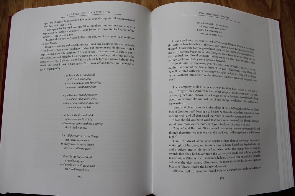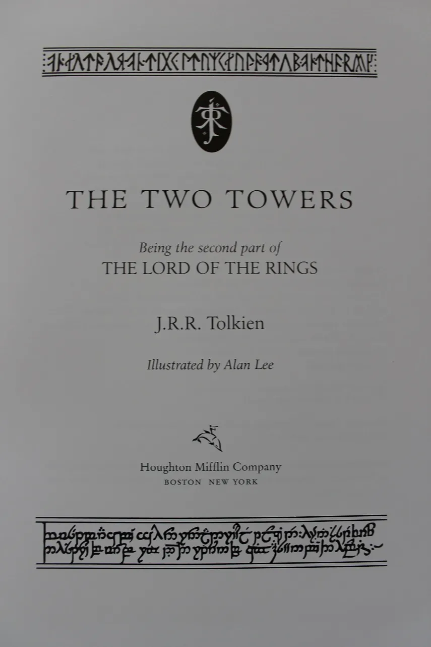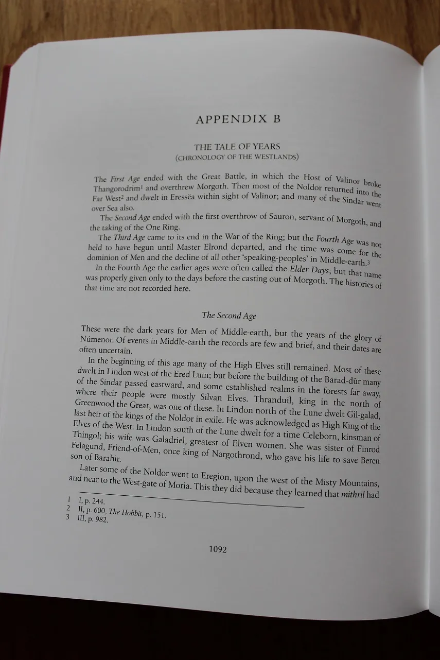 Обложка у них тоже очень твердая, но немного другая, нежели у Хоббита. Целостно, книга выглядит и держится в руках приятнее, чем The Hobbit. На переднем плане книги можно заметить странный знак. :) Когда я записывал видео, для меня он был загадкой, но позже правда открылась мне. Это оказались буквы аббревиатуры сшитые таким чудным образом: J R R T. Страницы в этом издании, по качеству, практически полностью соответствуют Хоббиту, разве что шрифт поменьше.