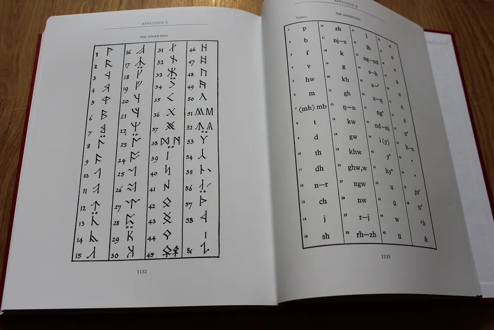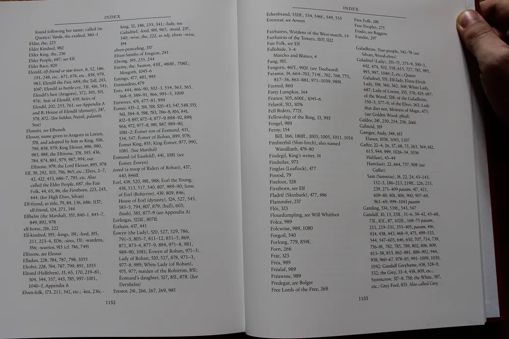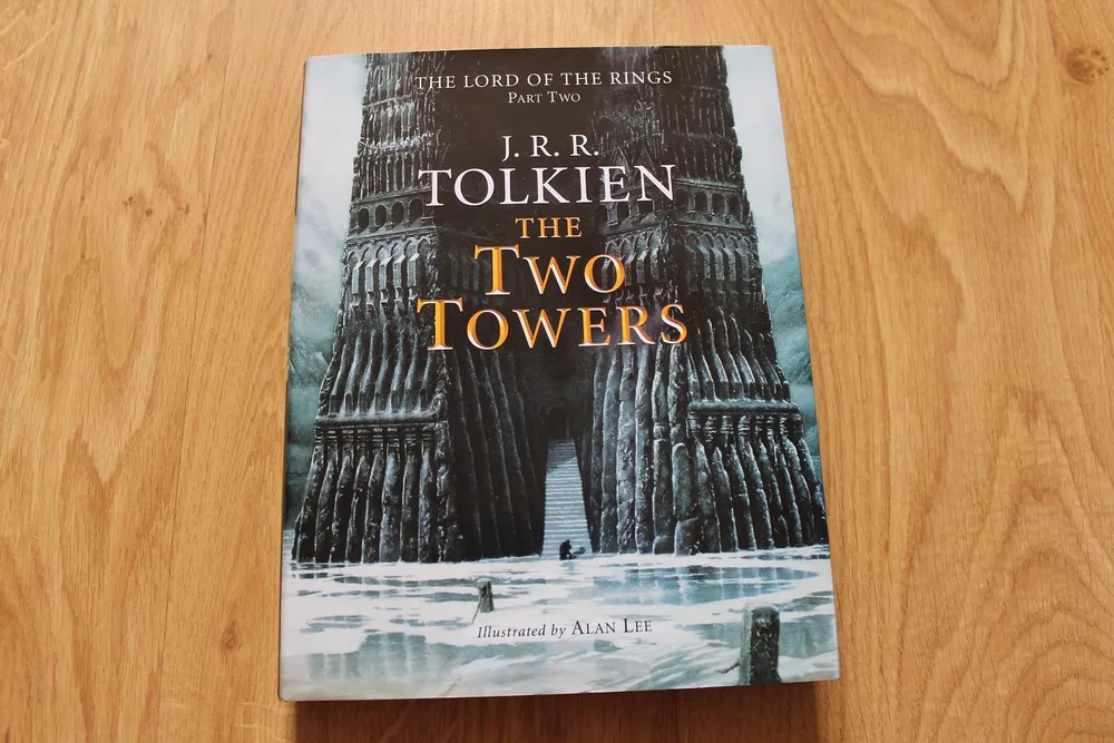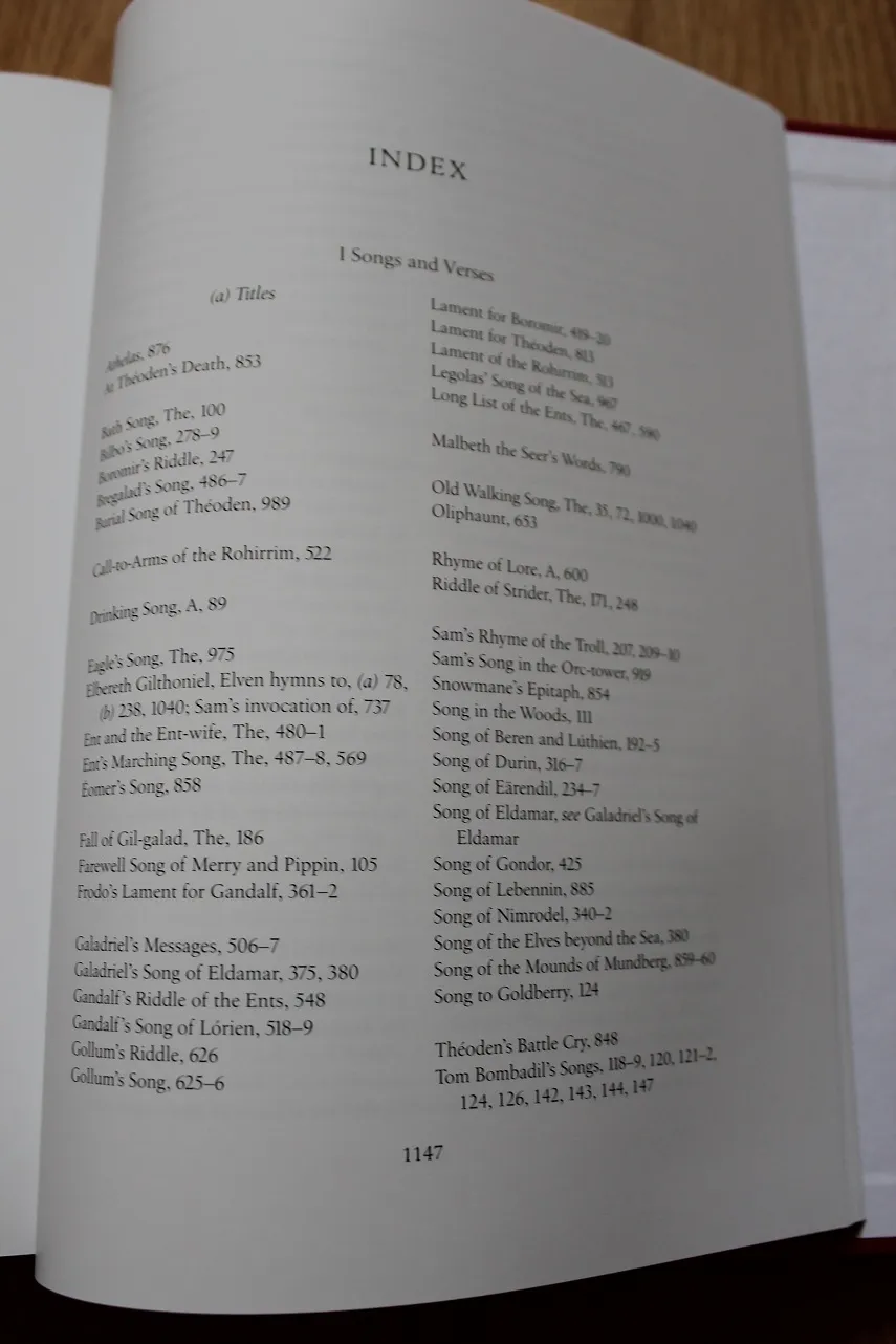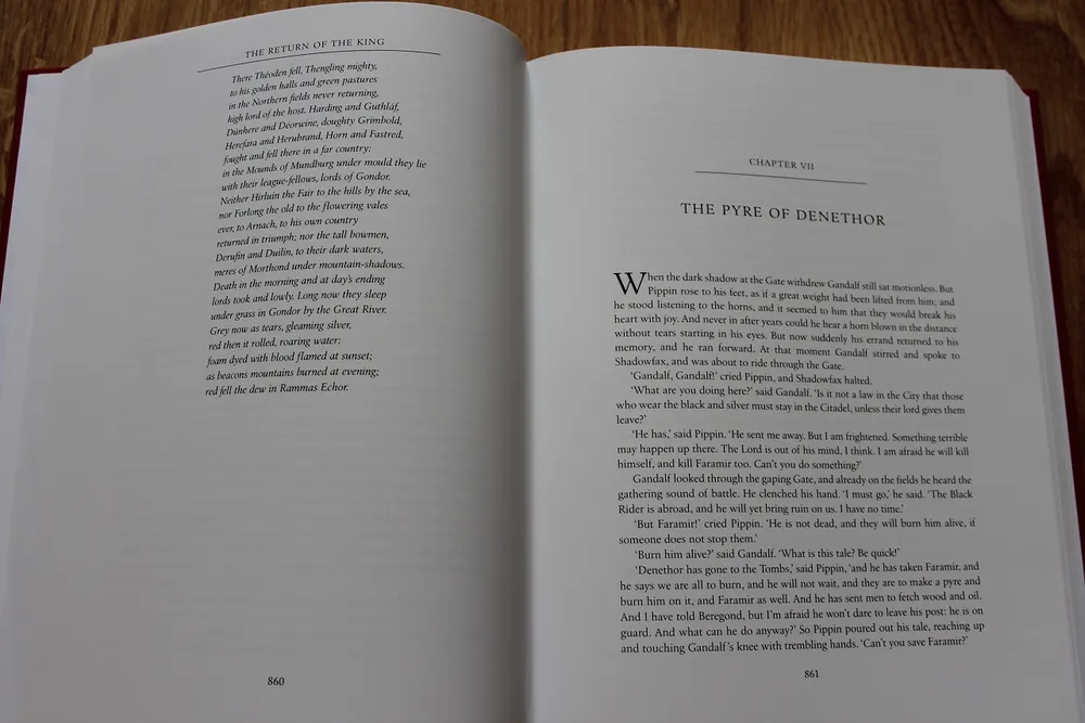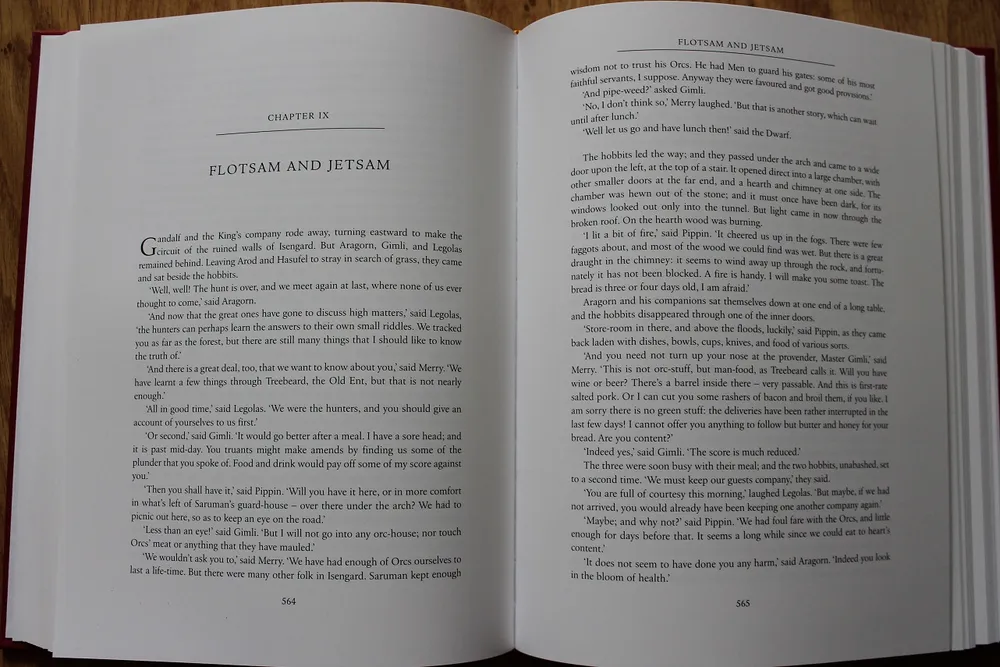Обложка у них тоже очень твердая, но немного другая, нежели у Хоббита. Целостно, книга выглядит и держится в руках приятнее, чем The Hobbit. На переднем плане книги можно заметить странный знак. :) Когда я записывал видео, для меня он был загадкой, но позже правда открылась мне. Это оказались буквы аббревиатуры сшитые таким чудным образом: J R R T. Страницы в этом издании, по качеству, практически полностью соответствуют Хоббиту, разве что шрифт поменьше.